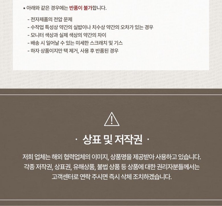 - ㆍ모니터 해상도의 차이로 인해 색상이나 이미지가 실제와 달라, 고객이 단순 변심으로 교환/반품을 무료로 요청하는 경우