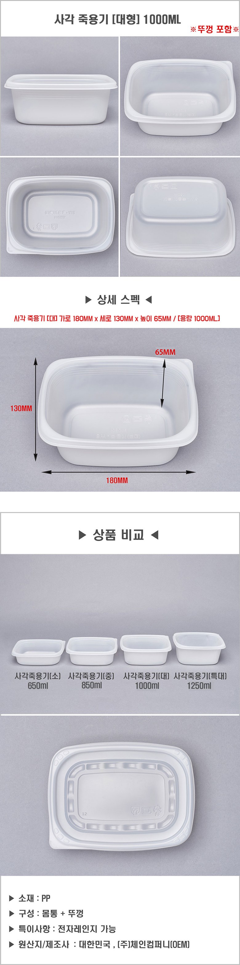 | 품명 및 모델명 | 사각 죽용기 대 1000ML | 인증/허가 사항 | 상품 상세페이지 참조 |
