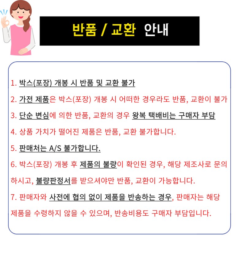 - ㆍ교환/반품에 관한 일반적인 사항은 판매자가 제시사항보다 관계법령이 우선합니다.
