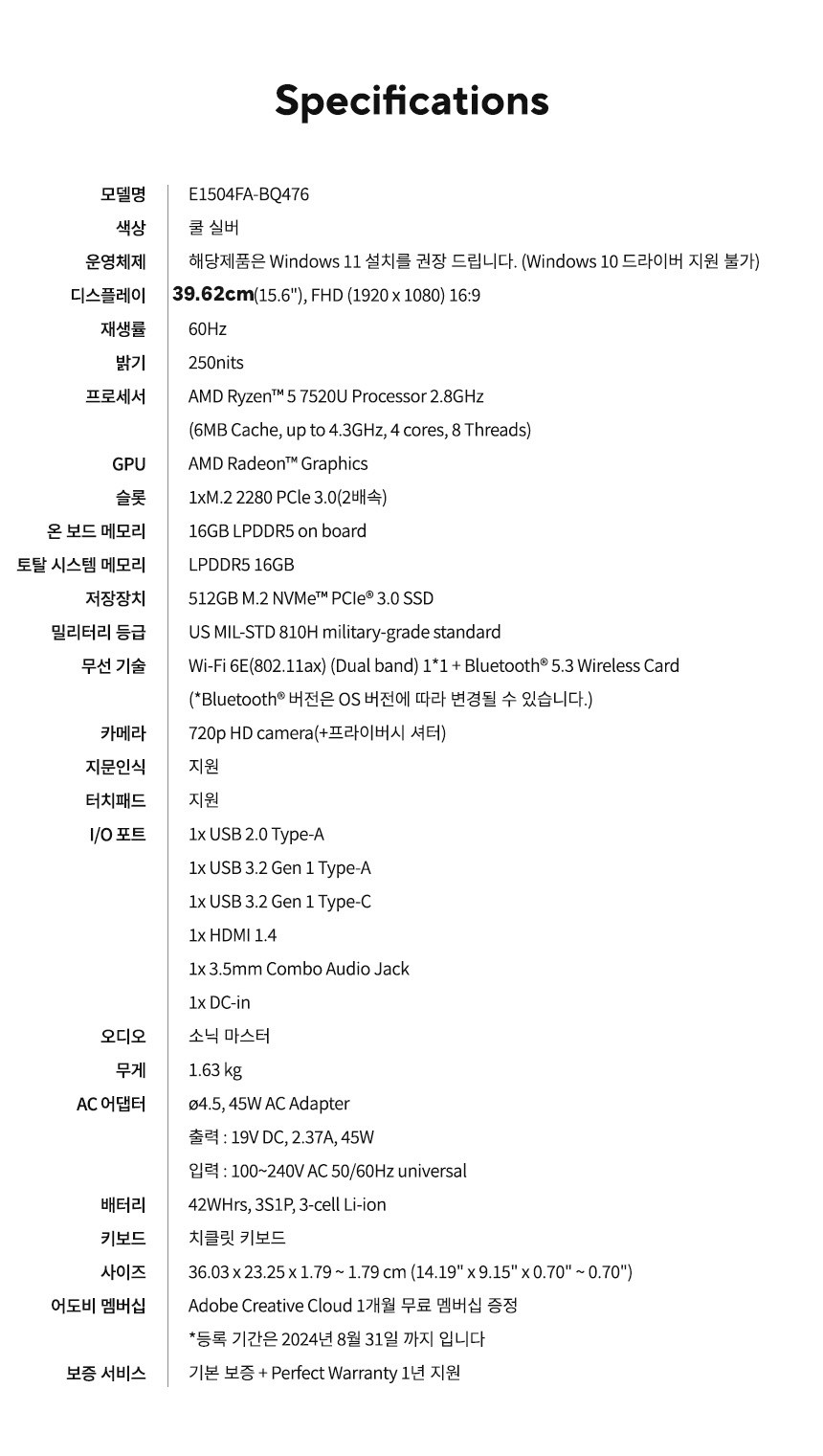 | 정격전압, 소비전력 | 컨텐츠참조 | 에너지소비효율등급 | 어댑터: 최저소비효율기준만족 |