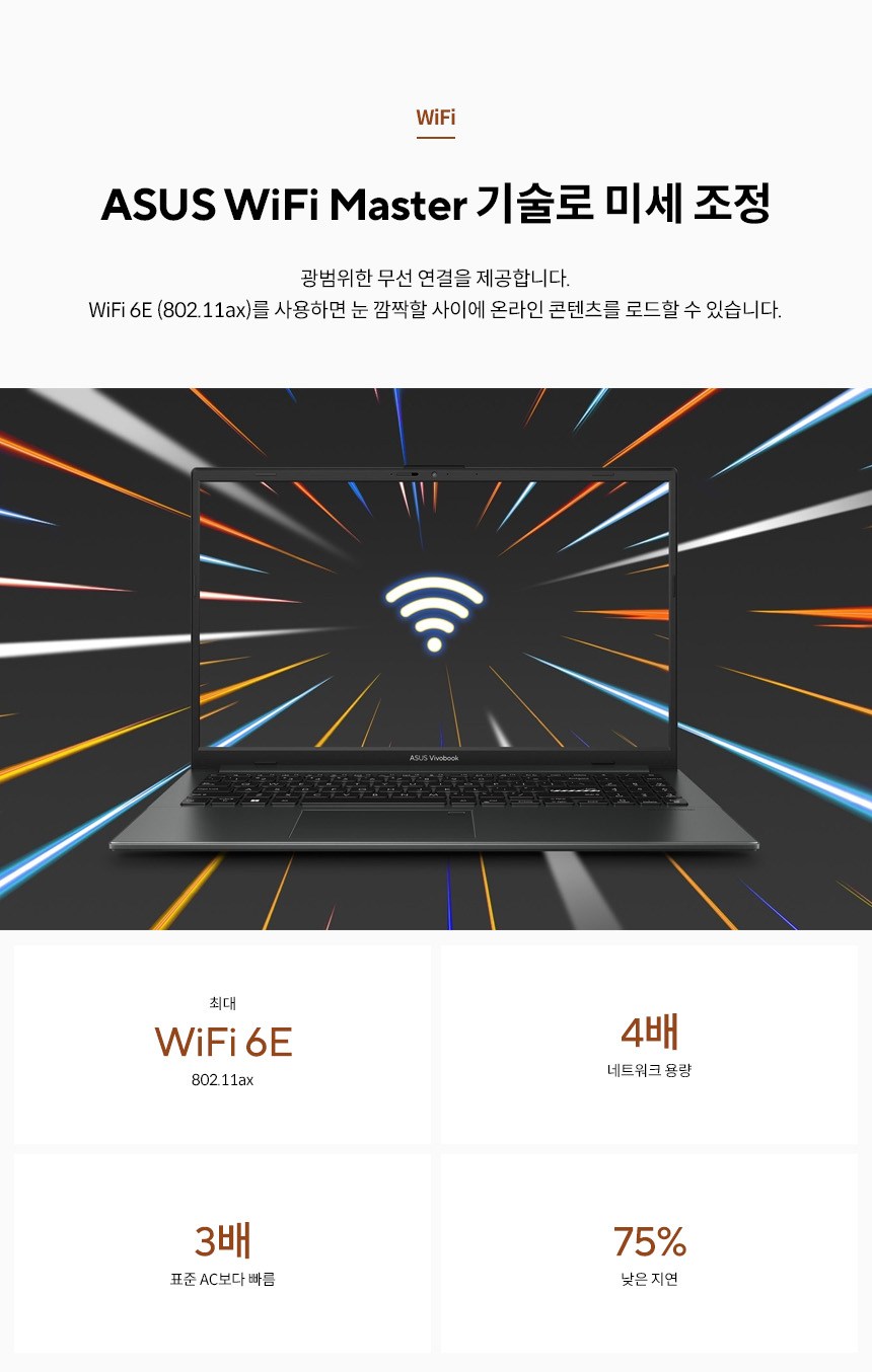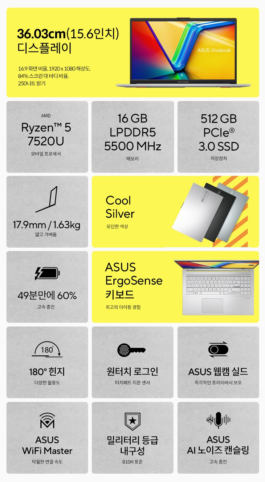| 품명 및 모델명 | Notebook PC, ASUS Vivobook Go / E1504F | KC 인증정보 | 본품: YU10210-22024A, R-R-MSQ-NB-E1504F, 특정소출력 무선기기: R-C-MD6-MT7902, 전지: XU100429-22188A, XU100253-23571A, 어댑터: SU10473-16020B, MSIP-REM-DVP-ADP-45ZEB |