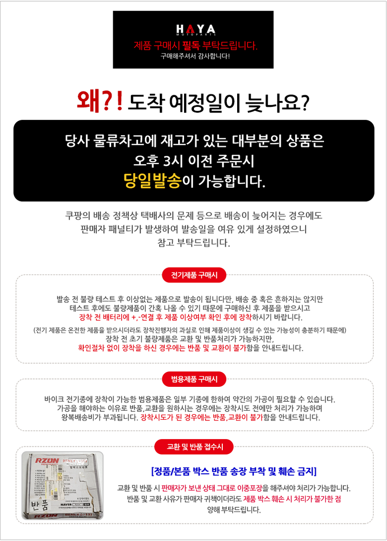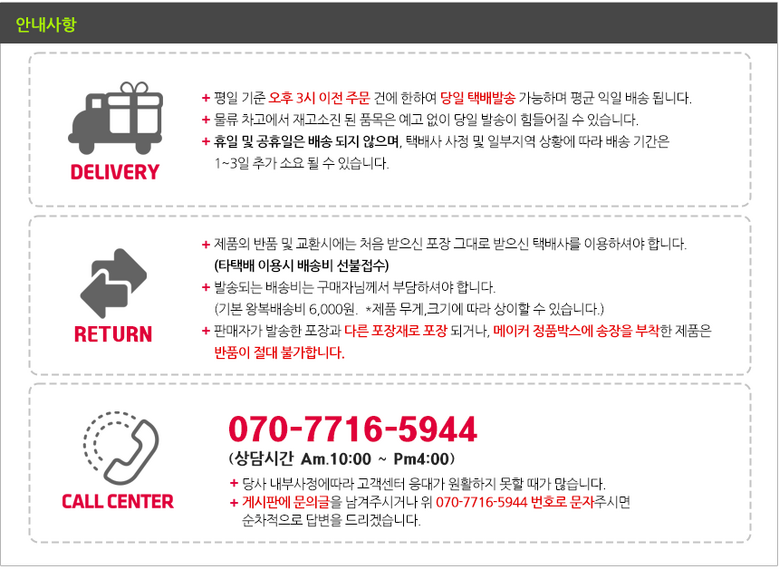 - ㆍ교환/반품에 관한 일반적인 사항은 판매자가 제시사항보다 관계법령이 우선합니다.
