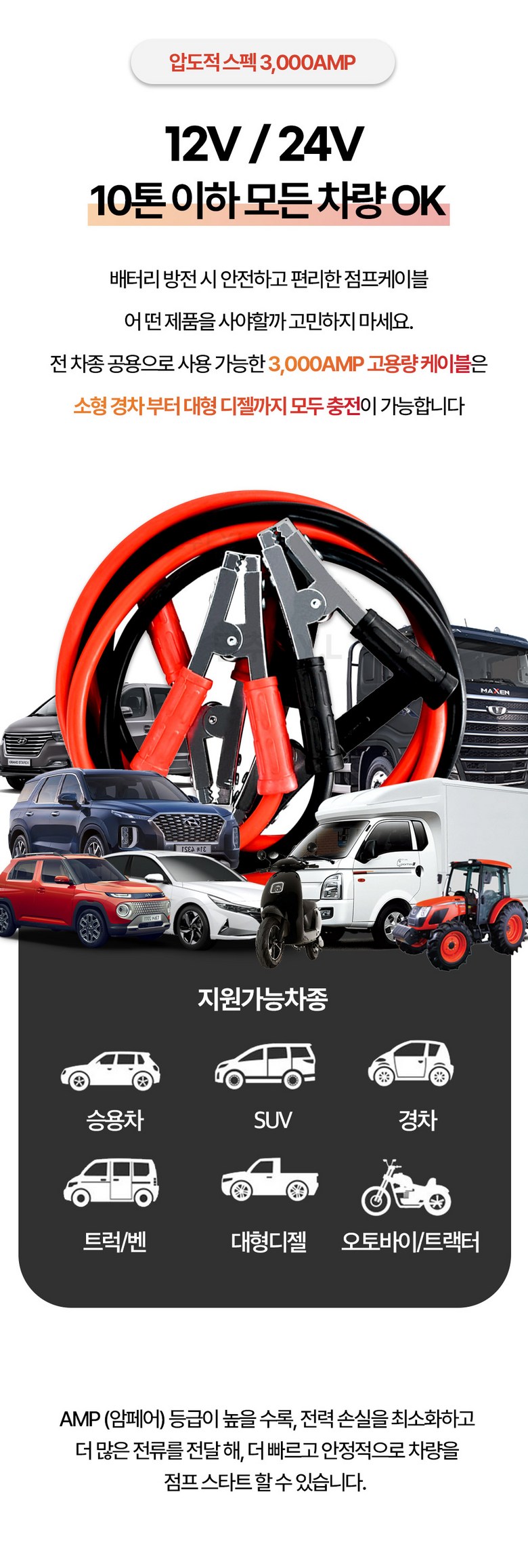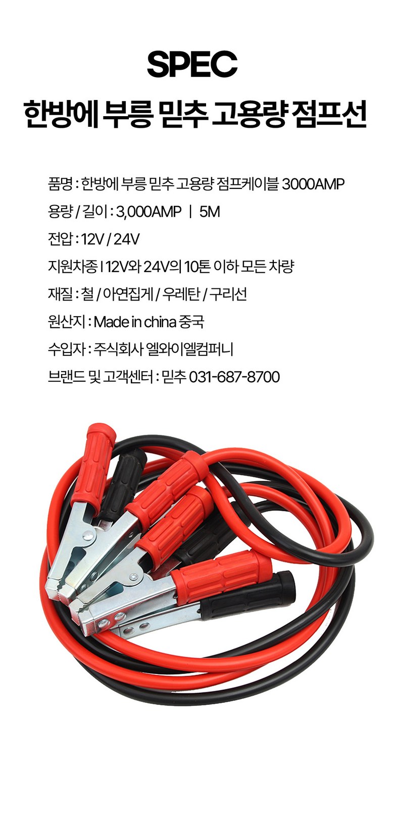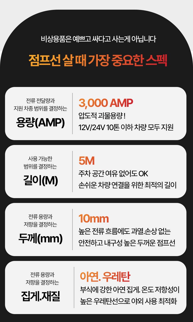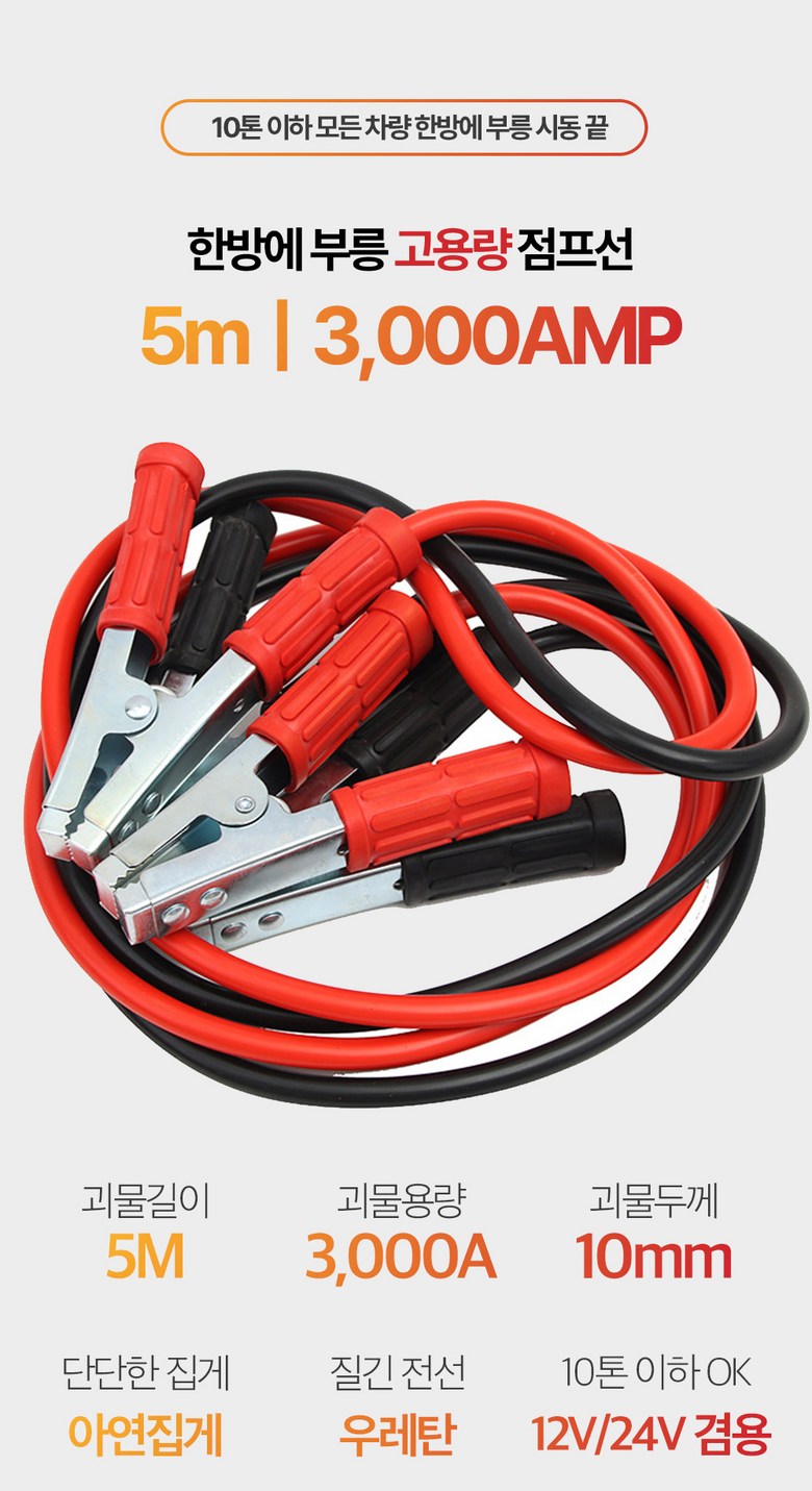 | 품명 및 모델명 | 3000AMP 고용량 5M 자동차 배터리 점프 케이블 12-24V 점프선 고강도 아연 집게 | 동일모델 출시년월 | 2024 |