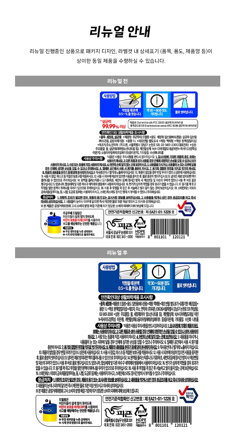 | 효과,효능 (승인대상 제품에 한함) | 리뉴얼 전: 대장균(Escherichia coli ATCC 25922) 살균력 99.99% 이상, 황색포도상구균(Staphylococcus aureus ATCC 6538) 살균력 99.99% 이상ㅣ리뉴얼 후: 해당없음 | 수입자(수입제품에 한함), 제조국 및 제조사 | 컨텐츠 참조 |