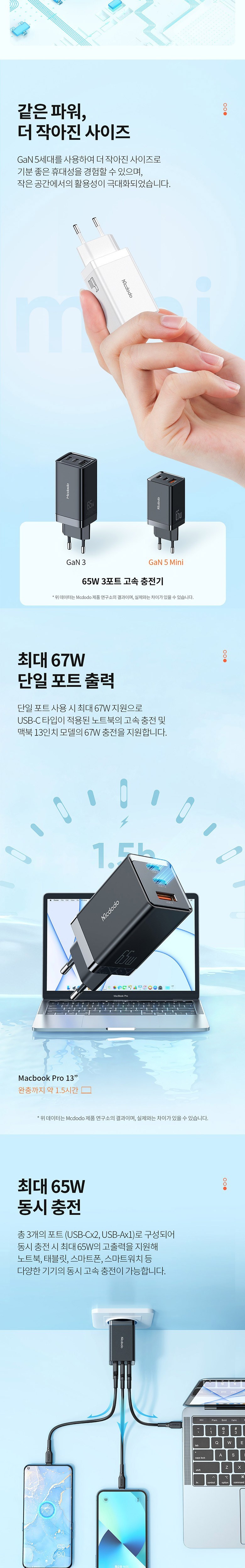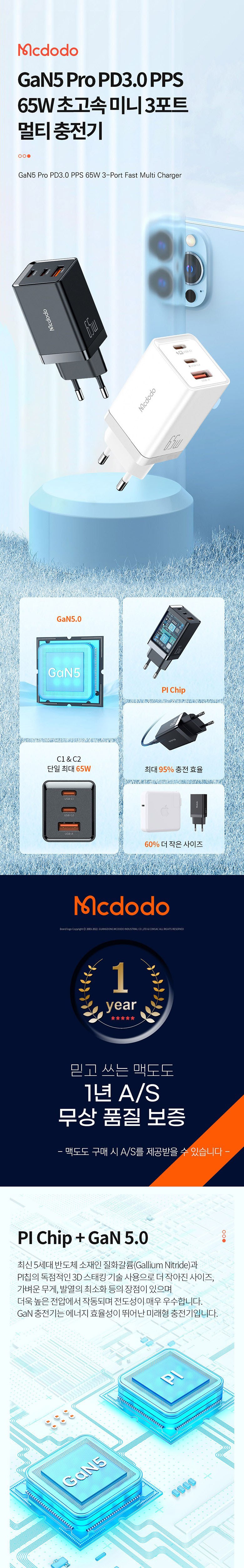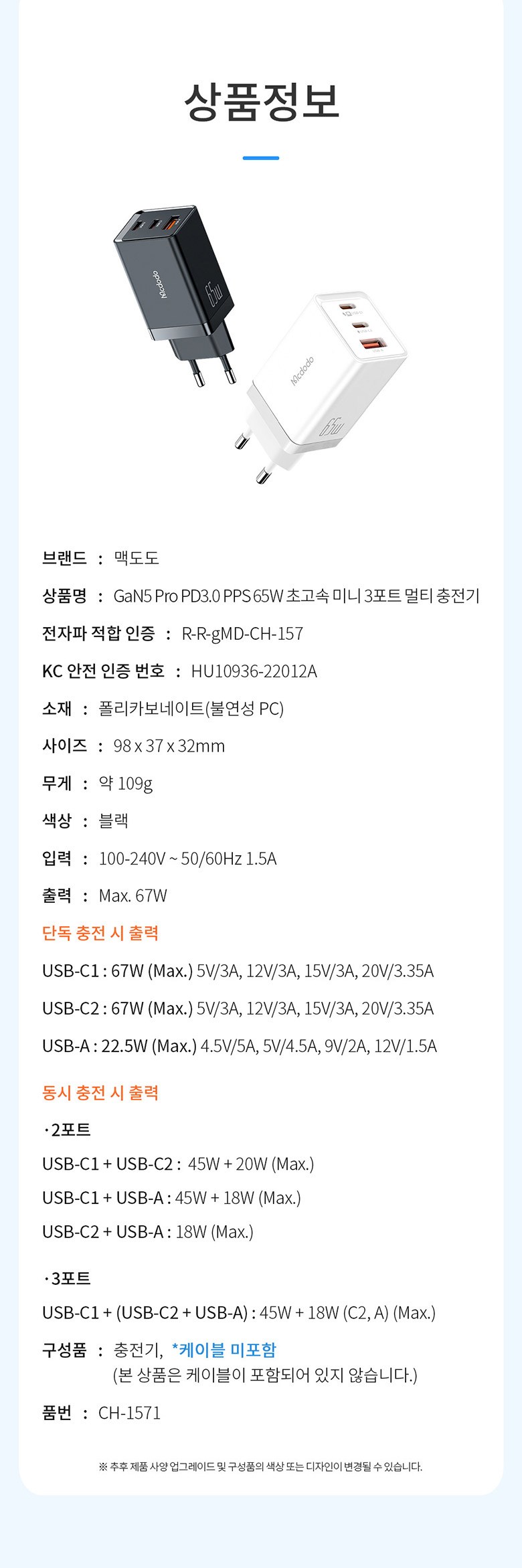 | 품명 및 모델명 | 맥도도 GaN5 Pro PD3.0 PPS 65W 초고속 미니 3포트 멀티충전기 - 화이트 / CH-1571 | KC 인증정보 | R-R-gMD-CH-157 , HU10936-22012A |