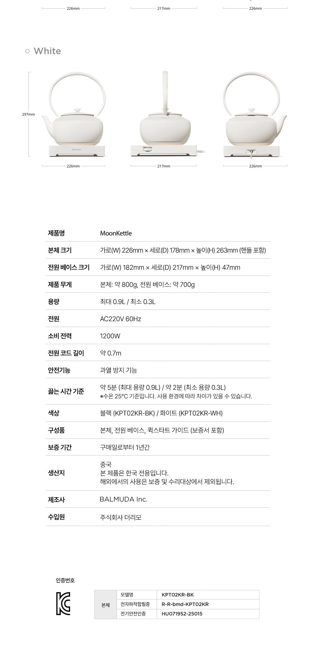 | 품명 및 모델명 | 전기주전자 / KPT02KR-BK | KC 인증정보 | HU071952-25015, R-R-bmd-KPT02KR |