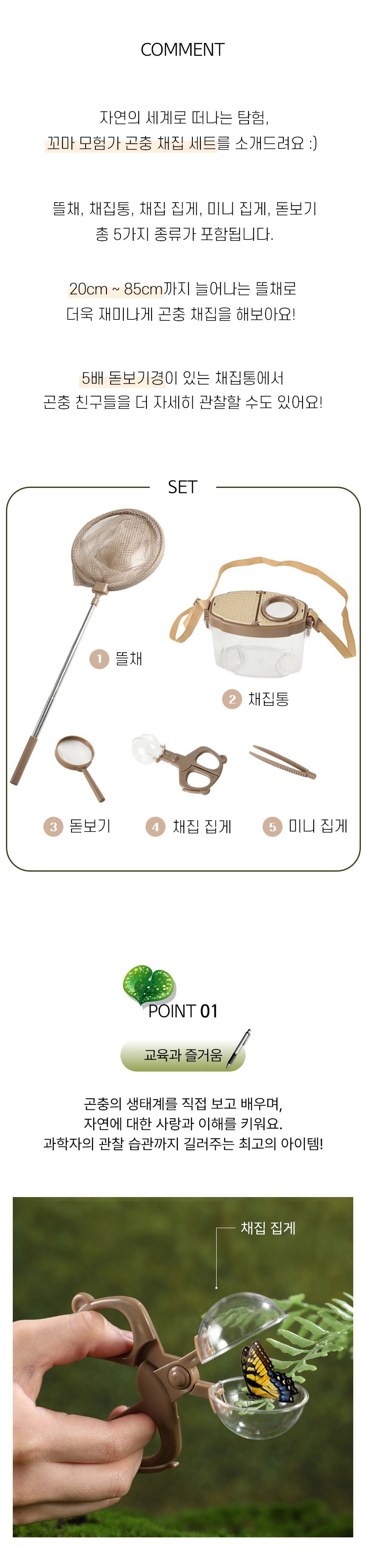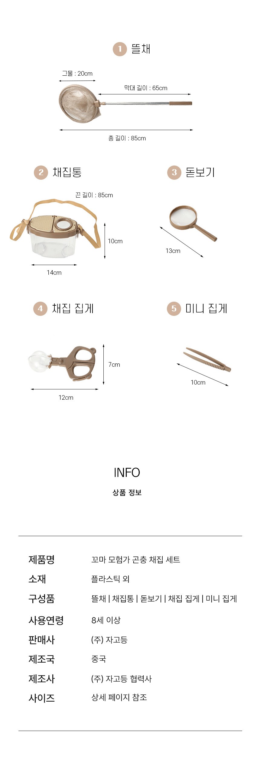 계좌이체- 사이즈: 뜰채(총 길이 85cm), 채집통(14cm x 10cm x 끈 길이 85cm), 돋보기(13cm), 채집 집게(12 x 7 cm), 미니 집게(10cm)