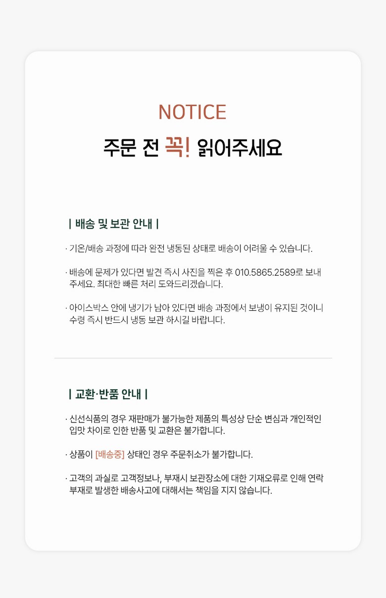 | 배송방법 | 신선/냉장/냉동 | 배송비 | 4,000원 - 25,000원 이상 구매 시 무료배송 · 도서산간 추가 배송비 - 제주 지역: 7,000원 - 도서산간 지역: 4,000원 |