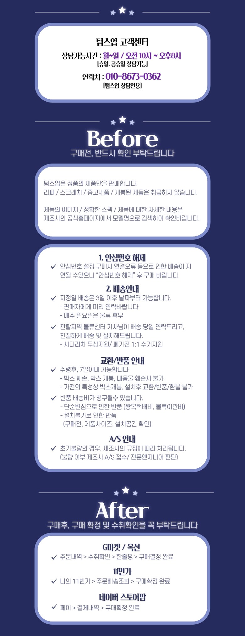 - ㆍ교환/반품에 관한 일반적인 사항은 판매자가 제시사항보다 관계법령이 우선합니다.
