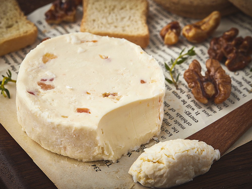 건조멜론, 건조망고가 쫄깃쫄깃 씹히는 크림치즈예요. 겉에는 건조코코넛이 콕콕 박혀 있어 오독오독한 식감까지 더해졌어요. 크림치즈의 고소함에 과일의 달짝지근한 풍미가 조화롭게 어우러지는 맛이 매력적이랍니다. 그대로 먹어도 좋고, 와인에 곁들일 안주로도 제격이에요.