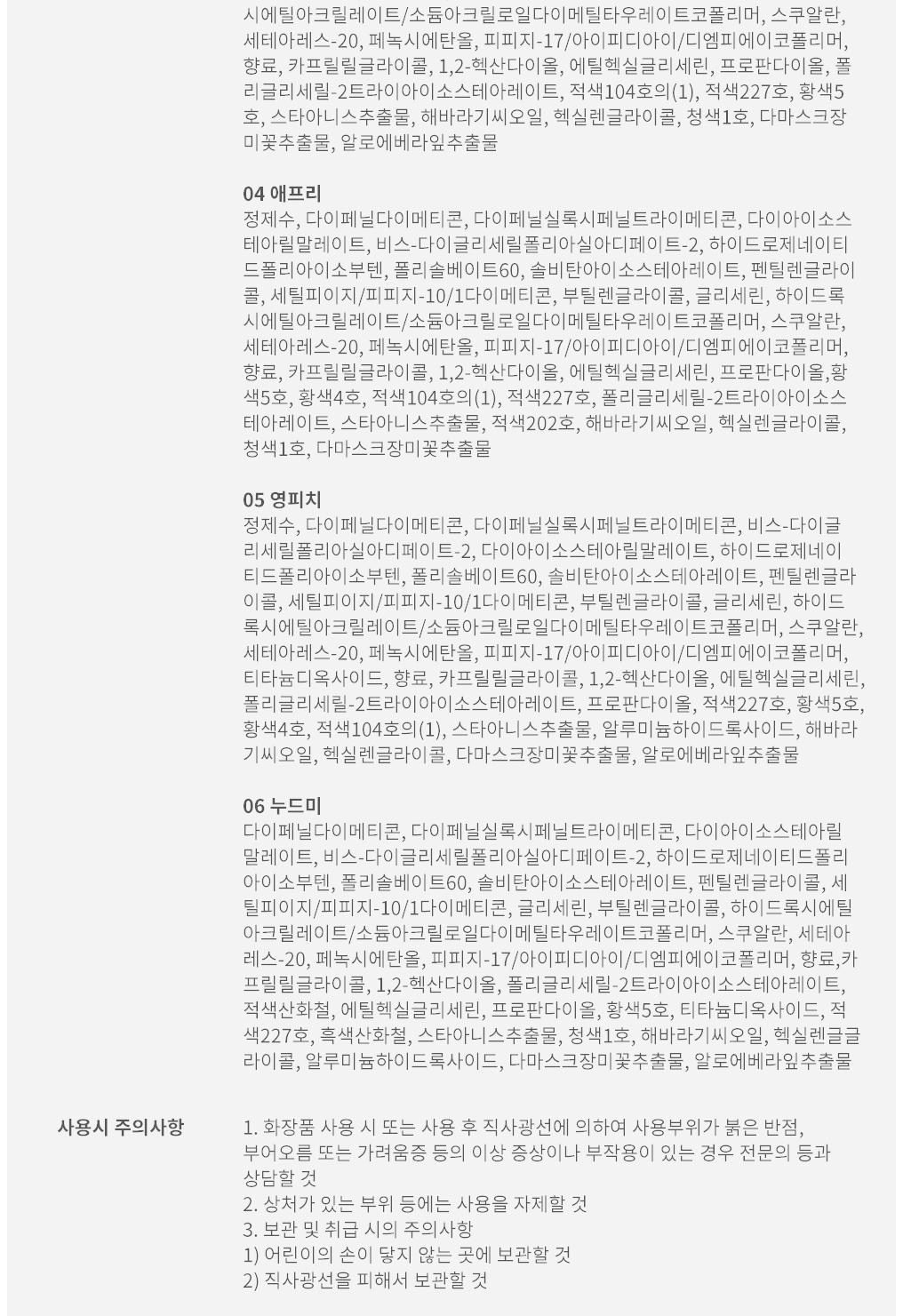 | 화장품제조업자, 화장품책임판매업자 및 맞춤형화장품판매업자 | 컨텐츠 참조 | 제조국 | 컨텐츠 참조 |