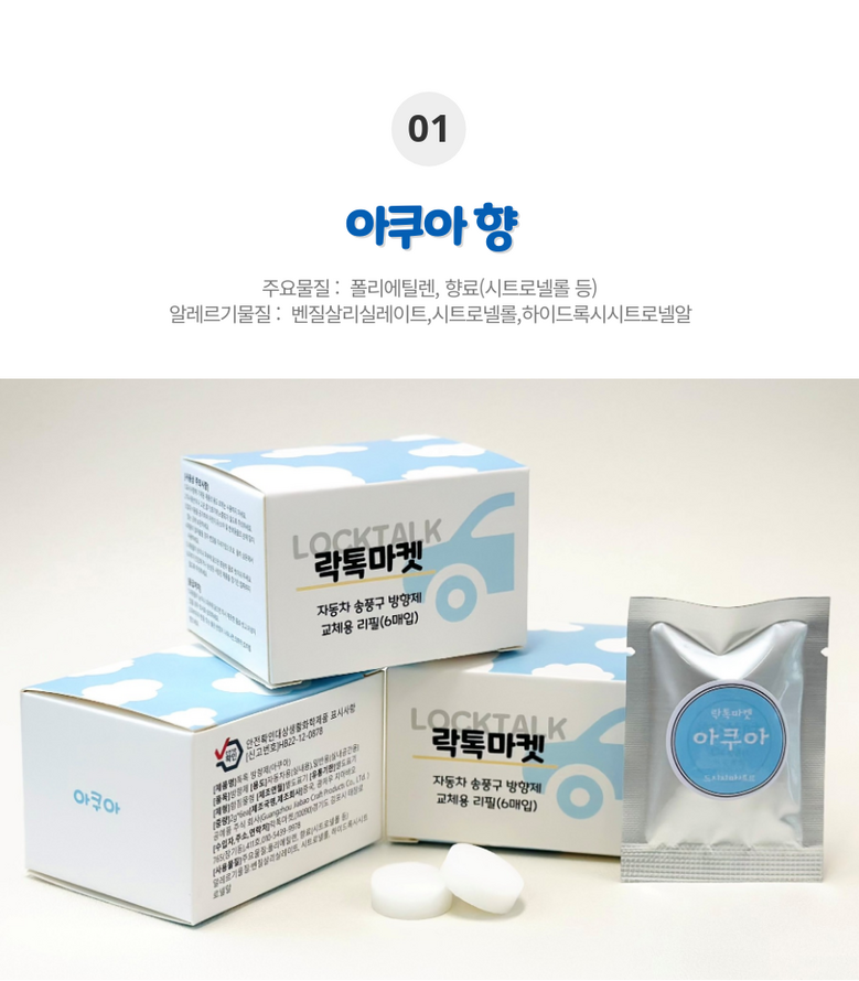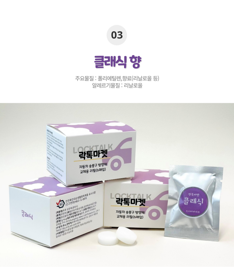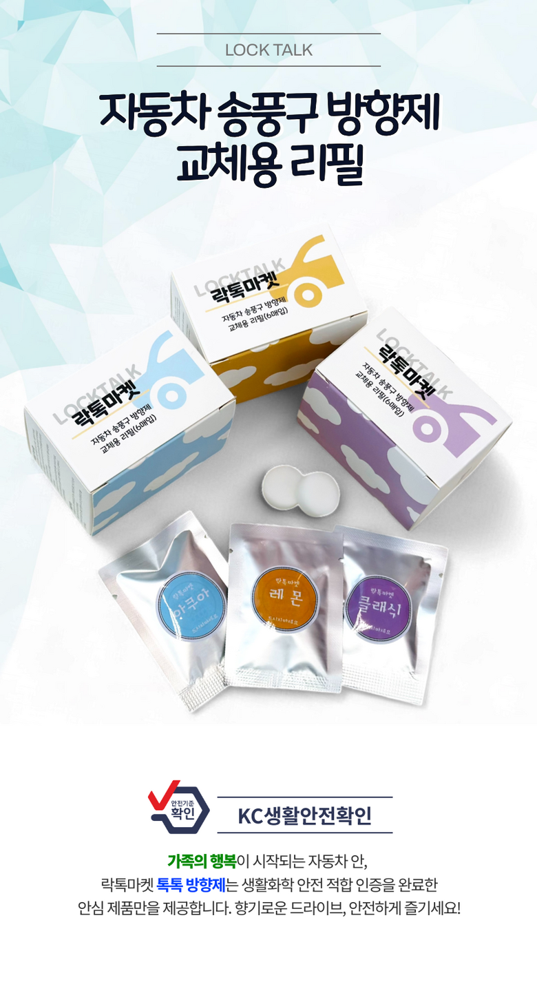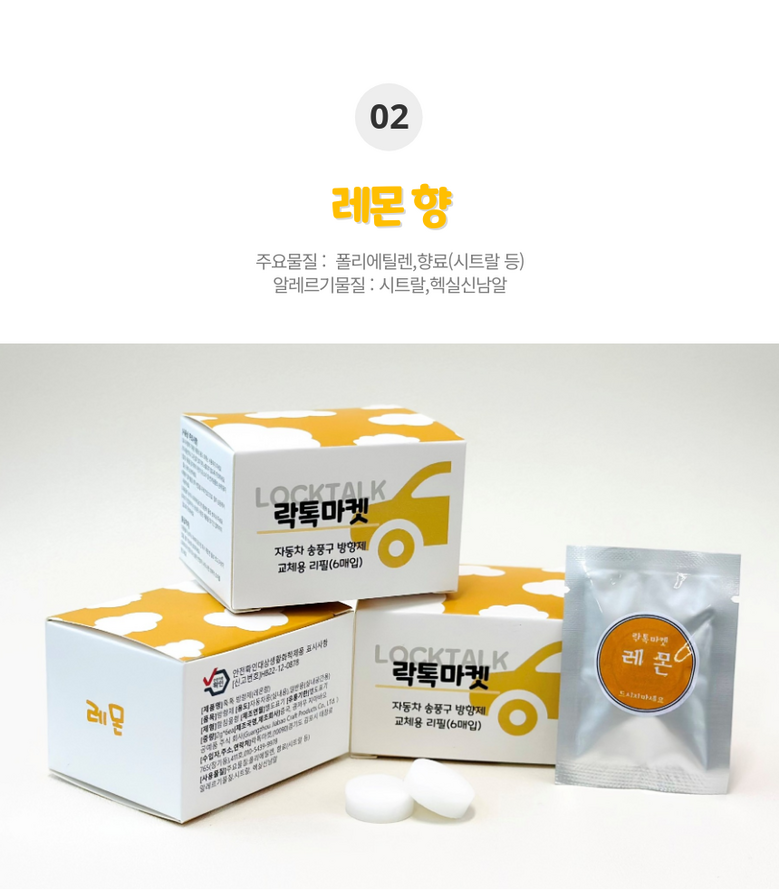 | 품명 및 모델명 | 톡톡방향제 송풍구프로펠러 리필킷 아쿠아/클래식/레몬향 | 인증/허가 사항 | 생활화학안전인증 |