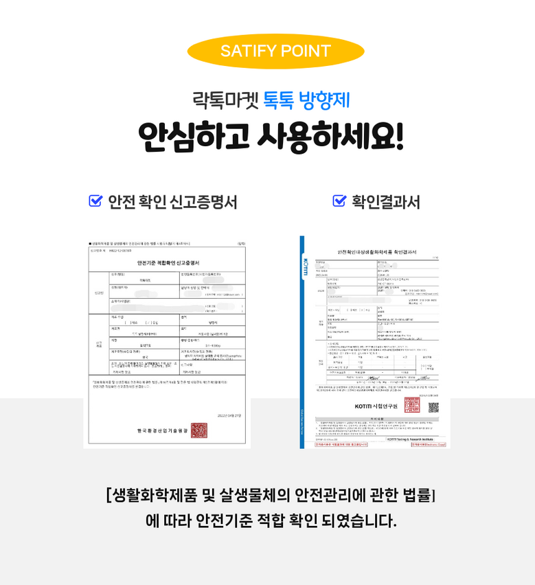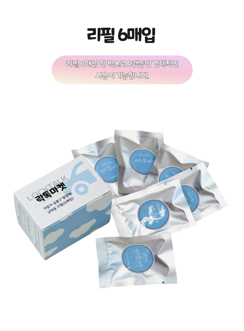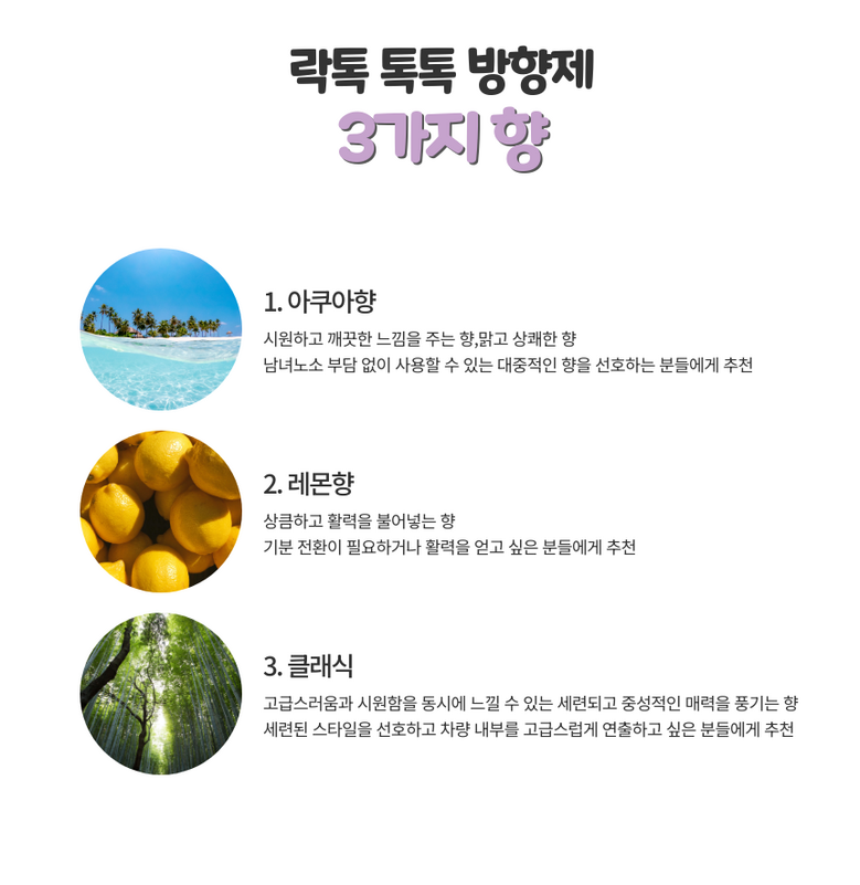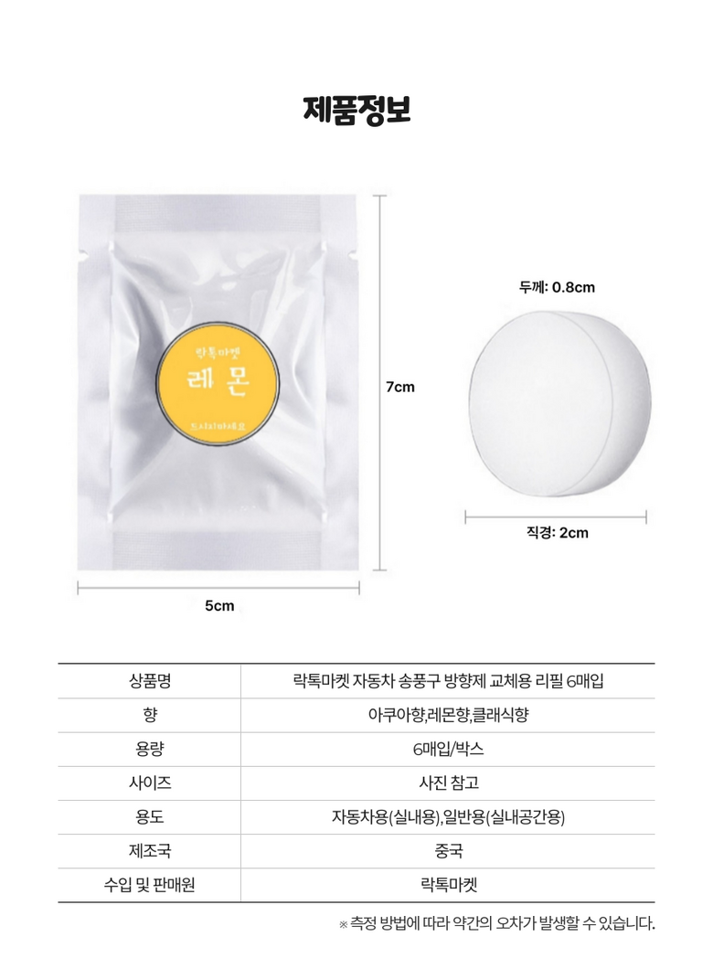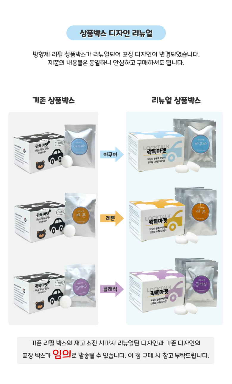 | 품명 및 모델명 | 톡톡방향제 송풍구프로펠러 리필킷 아쿠아/클래식/레몬향 | 인증/허가 사항 | 생활화학안전인증 |