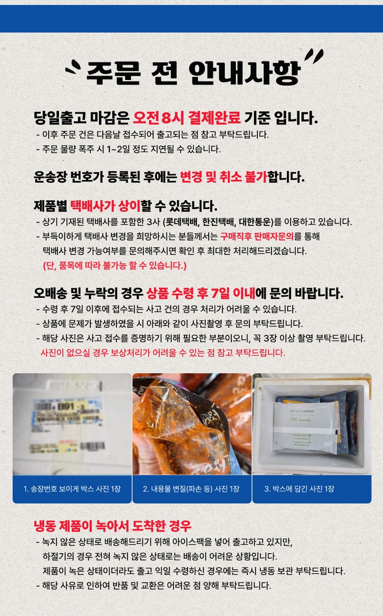 5. 배송이 하루이상 소요되는 택배특성상 아이스팩이 녹아 상품수령시 해동되었더라도 냉동식품은 즉시 냉동(-18도 이하), 냉장식품은 냉장실에 보관하시면 위생 및 영양에 아무런 문제없이 드실 수 있으니 안심하셔도 됩니다.