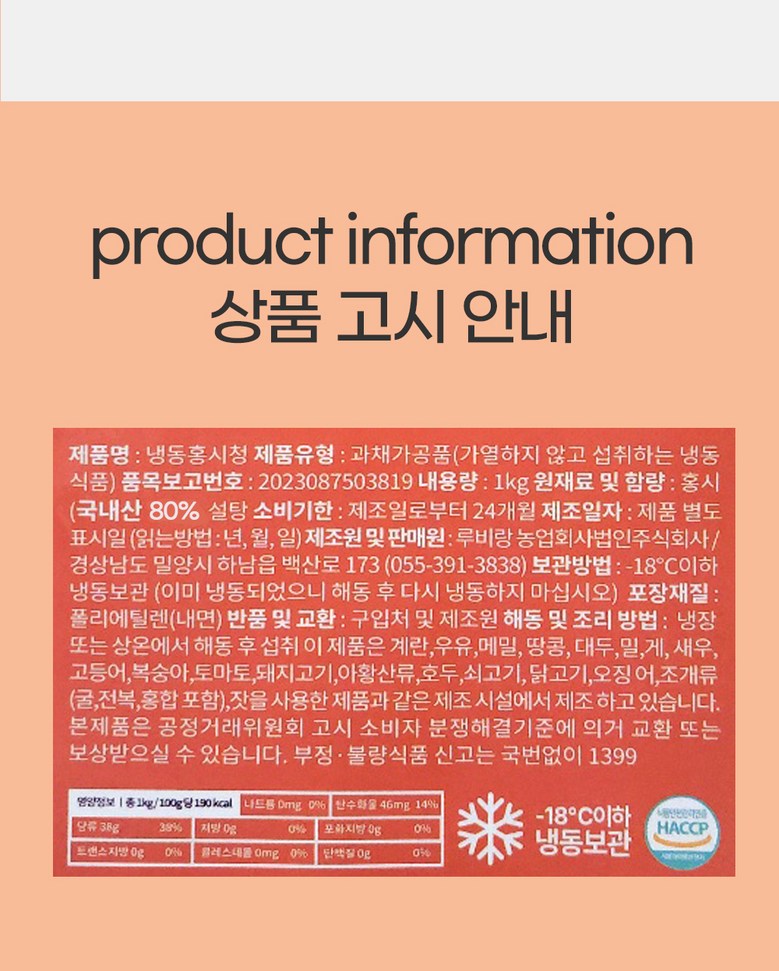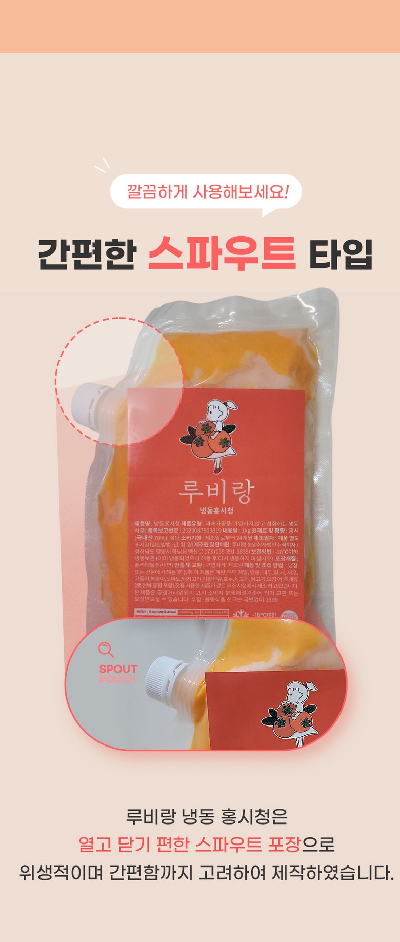 | 포장단위별 내용물의 용량(중량), 수량 | 스파우트 1kg | 원재료명 및 함량 | 홍시70%(국산),백설탕(국산) |