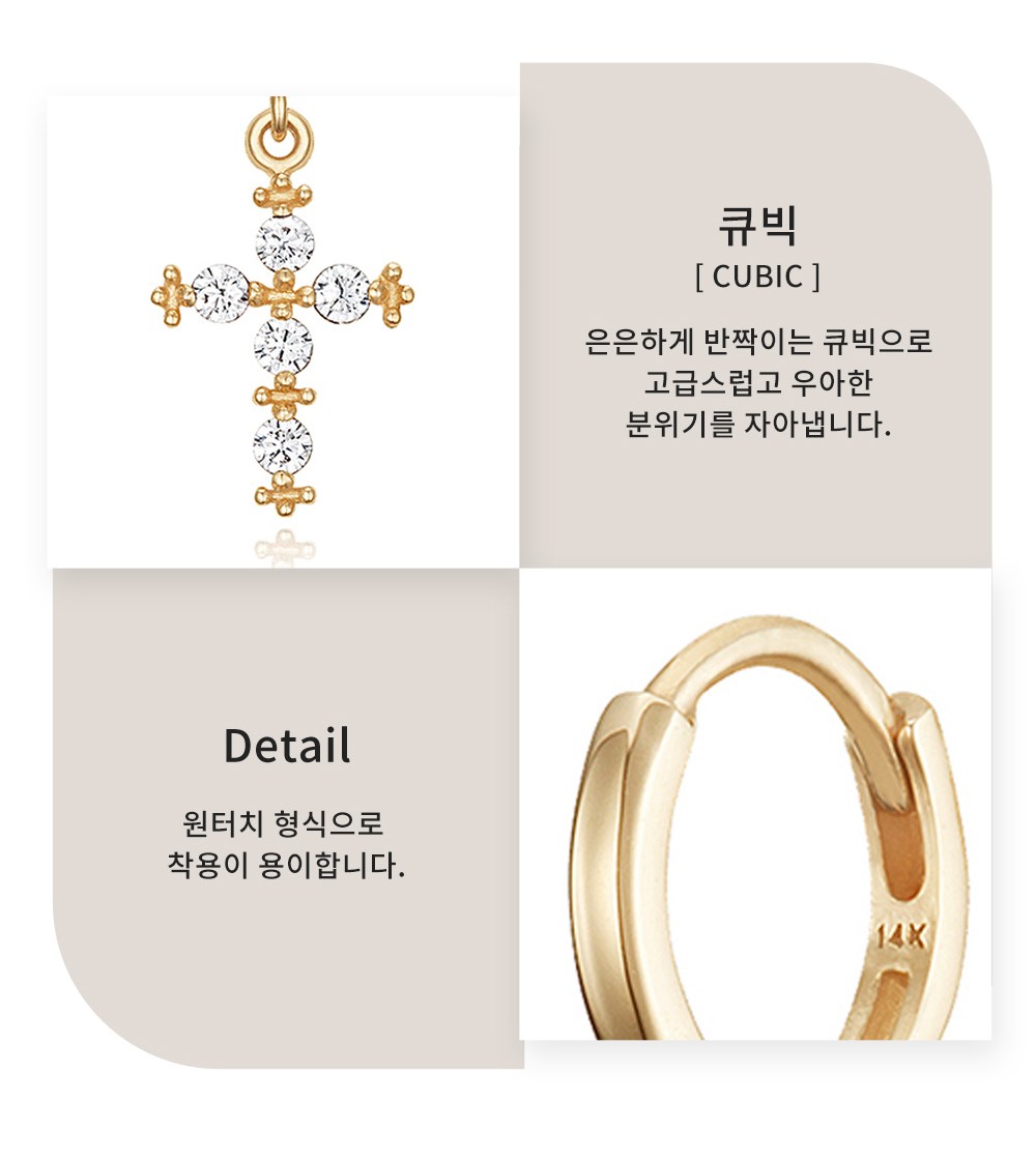 | 치수 | 컨텐츠 참조 | 착용 시 주의사항 | -제품 착용 후 제품에 스크래치 발생이나 변식이 최소화될 수 있도록 부드러운 천으로 닦아 폴리 백에 보관해주시기 바랍니다. -물,향수,화장품에 의해 변색되거나 마찰,충격 등에 의해 스크래치가 생길 수 있으므로 충분한 주의 바랍니다. -14K 골드 제품 특성상 순금의 함유량이 높고 연성을 지니고 있어 휘어질 수 있습니다. -진주는 유기질 보석으로 광택이 손상될 수 있으니 착용 및 보관에 주의바랍니다. |