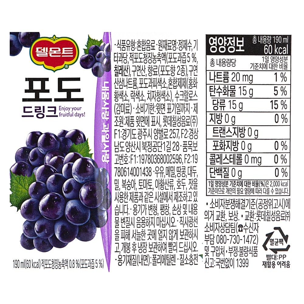 | 제품명 | 델몬트포도드링크 | 식품의 유형 | 컨텐츠 참조 |