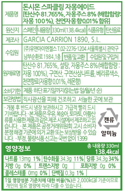 | 포장단위별 내용물의 용량(중량), 수량 | 330ml x 18개입 | 원재료명 및 함량 | 컨텐츠 참조 |