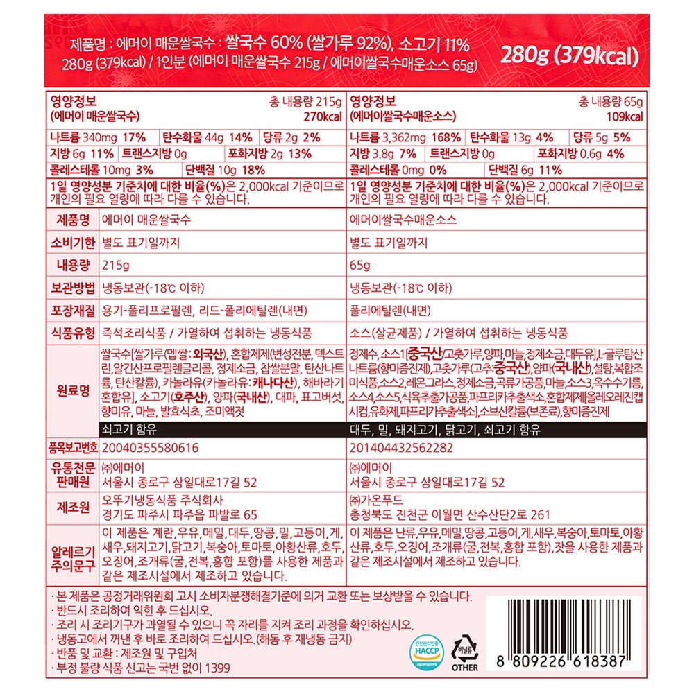 | 포장단위별 내용물의 용량(중량), 수량 | 280g x 2개 | 원재료명 및 함량 | 컨텐츠 참조 |