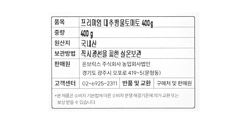 맛, 식감, 향 무엇 하나 빠지지 않는 프리미엄 대추방울토마토입니다. 길쭉한 모양새가 대추를 닮았다고 하여 ‘대추방울토마토’라고 이름 지어졌는데요. 일반 방울토마토보다 식감이 아삭아삭하고, 과즙에서 달콤함이 느껴지는 게 특징입니다. 은은한 산미와 진한 단맛의 조화가 입안을 가득 채워줘요. 농가에서 1차적으로 고른 후 당일 2차 선별을 거쳐 품질 좋은 것으로만 엄선했죠. 흐르는 물에 씻어 과실 본연의 맛 그대로 즐겨보세요.