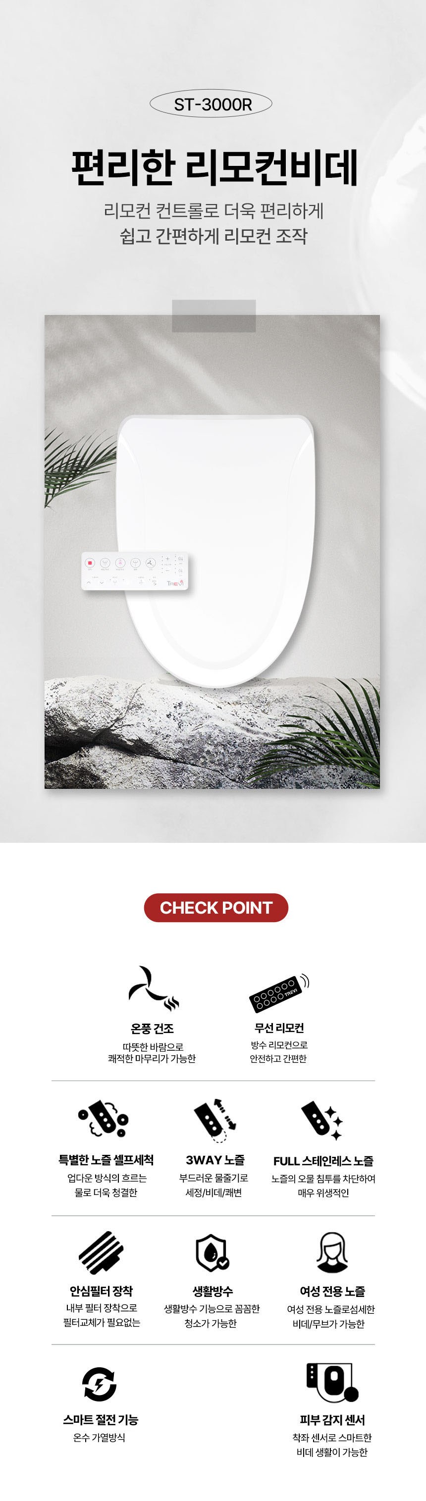| 품명 및 모델명 | 트레비 리모컨 방수 비데 ST-3000R | KC 인증정보 | 본품: HH072010-20008O, R-R-A1L-ALB-R3650 / 건전지 : B052L001-7122G |