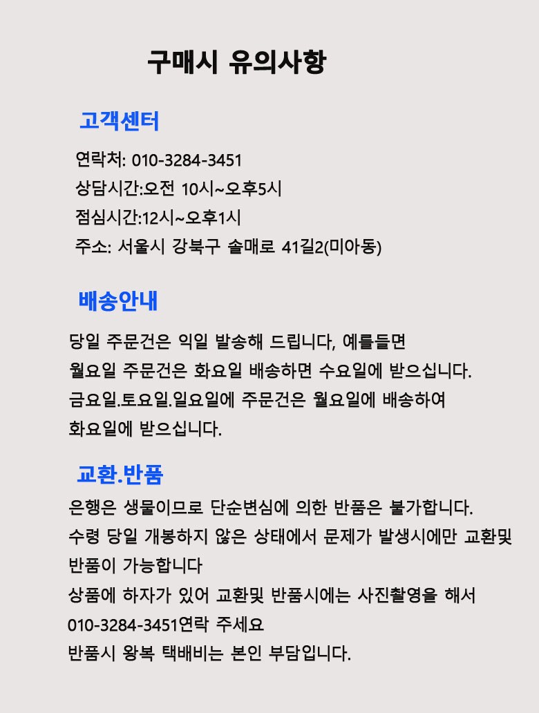 - ㆍ모니터 해상도의 차이로 인해 색상이나 이미지가 실제와 달라, 고객이 단순 변심으로 교환/반품을 무료로 요청하는 경우