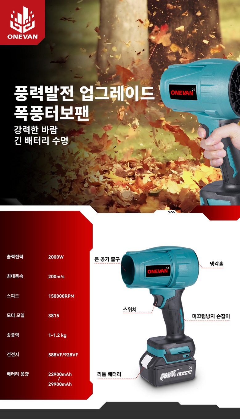 | 품명 및 모델명 | ONEVAN 무선 송풍기 터보 제트 블로워 | KC 인증정보 | 인증/허가필 |