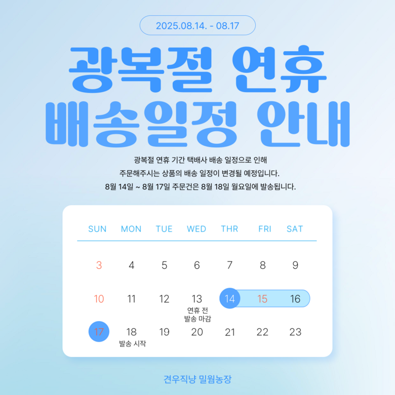 | 배송기간 | ㆍ도서산간 지역 등은 배송에 3-5일이 더 소요될 수 있습니다. - 천재지변, 물량 수급 변동 등 예외적인 사유 발생 시, 다소 지연될 수 있는 점 양해 부탁드립니다. | ||