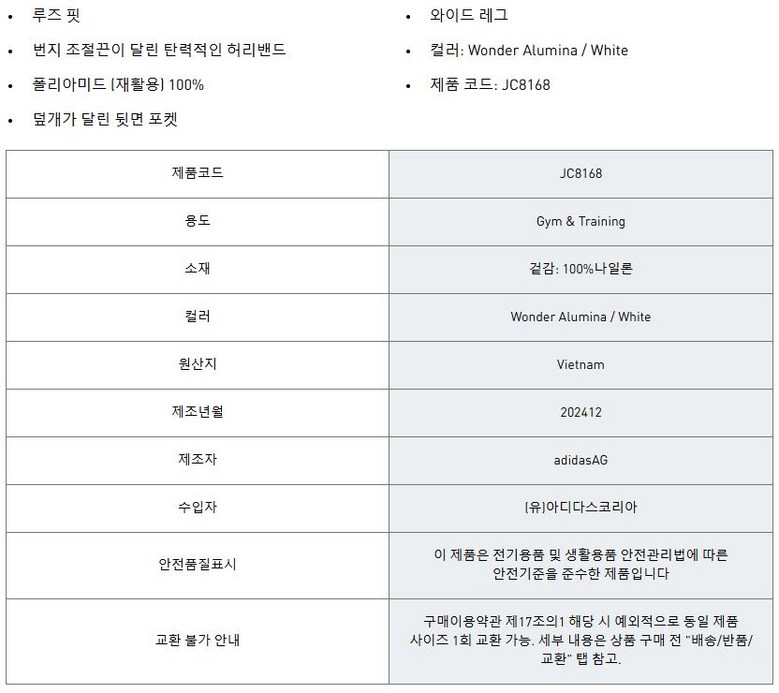 | 제조국 | 상품 상세페이지 참조 | 세탁방법 및 취급시 주의사항 | 상품 상세페이지 참조 |