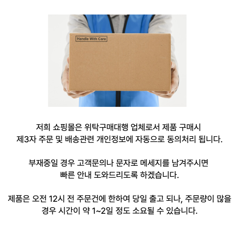 | 배송기간 | ㆍ도서산간 지역 등은 배송에 3-5일이 더 소요될 수 있습니다. - 천재지변, 물량 수급 변동 등 예외적인 사유 발생 시, 다소 지연될 수 있는 점 양해 부탁드립니다. | ||