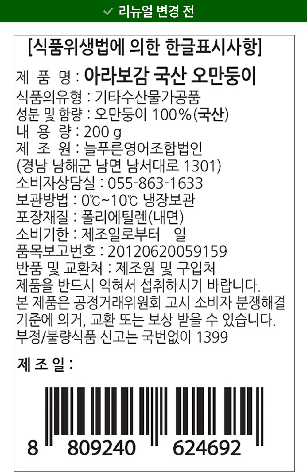 - 제조년월일: 필수표기정보 기재란 참조