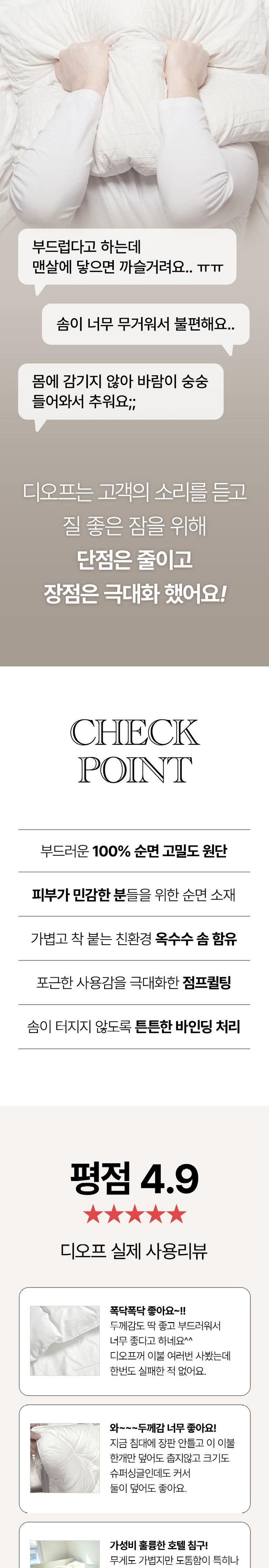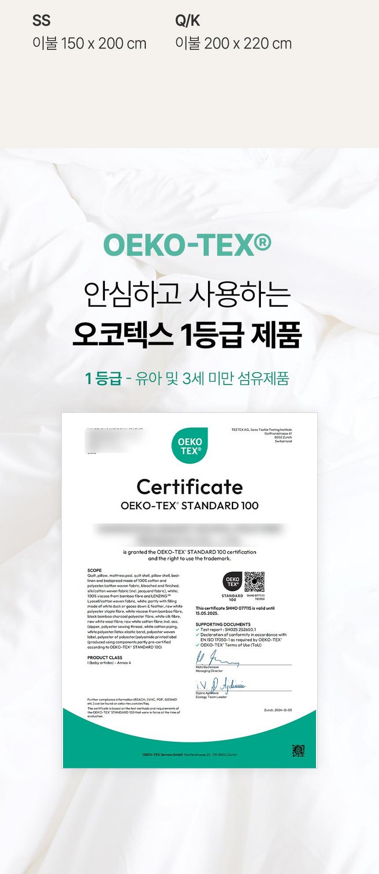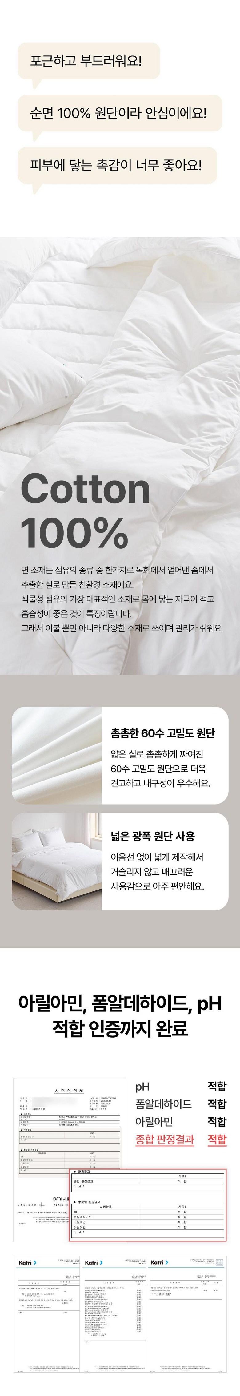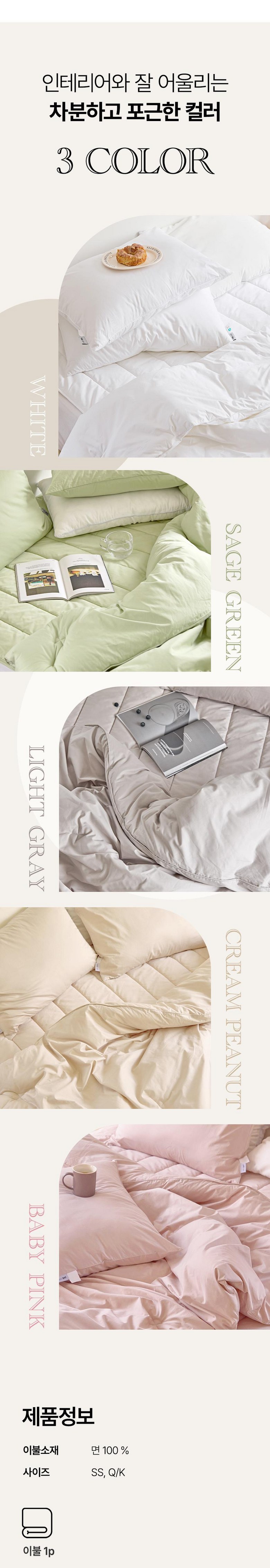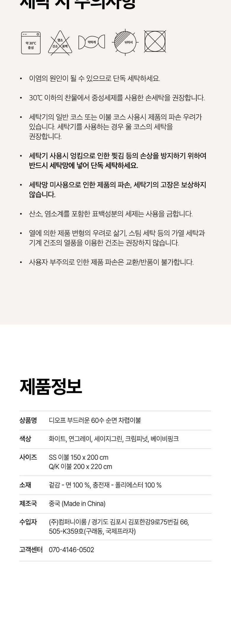 | 치수 | 슈퍼싱글: 150 x 200 cm퀸/킹겸용: 200 x 220 cm | 제품구성 | 면이불 1장 |