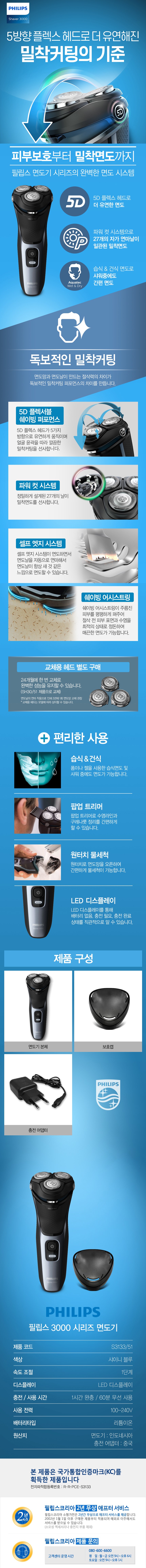 | 품명 및 모델명 | 필립스 전기면도기 3000 시리즈 / S3133/51 | KC 인증정보 | 어댑터 : SU07254-14002 / 본품 : R-R-PCE-S3133 |