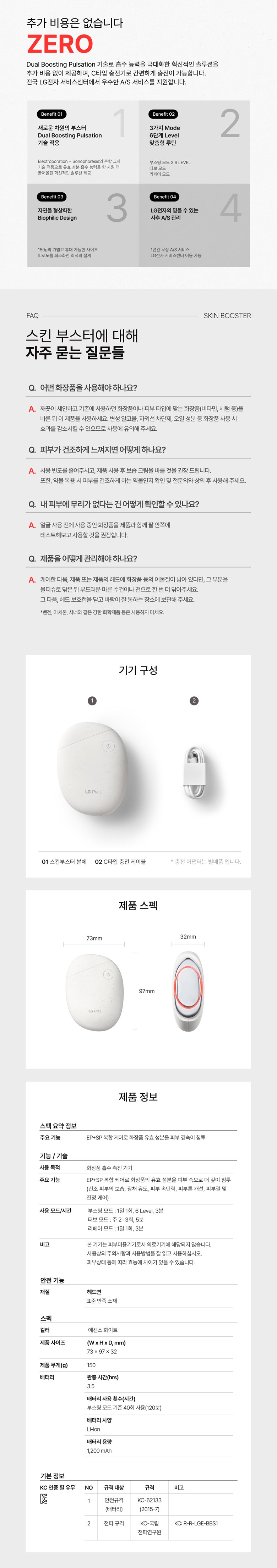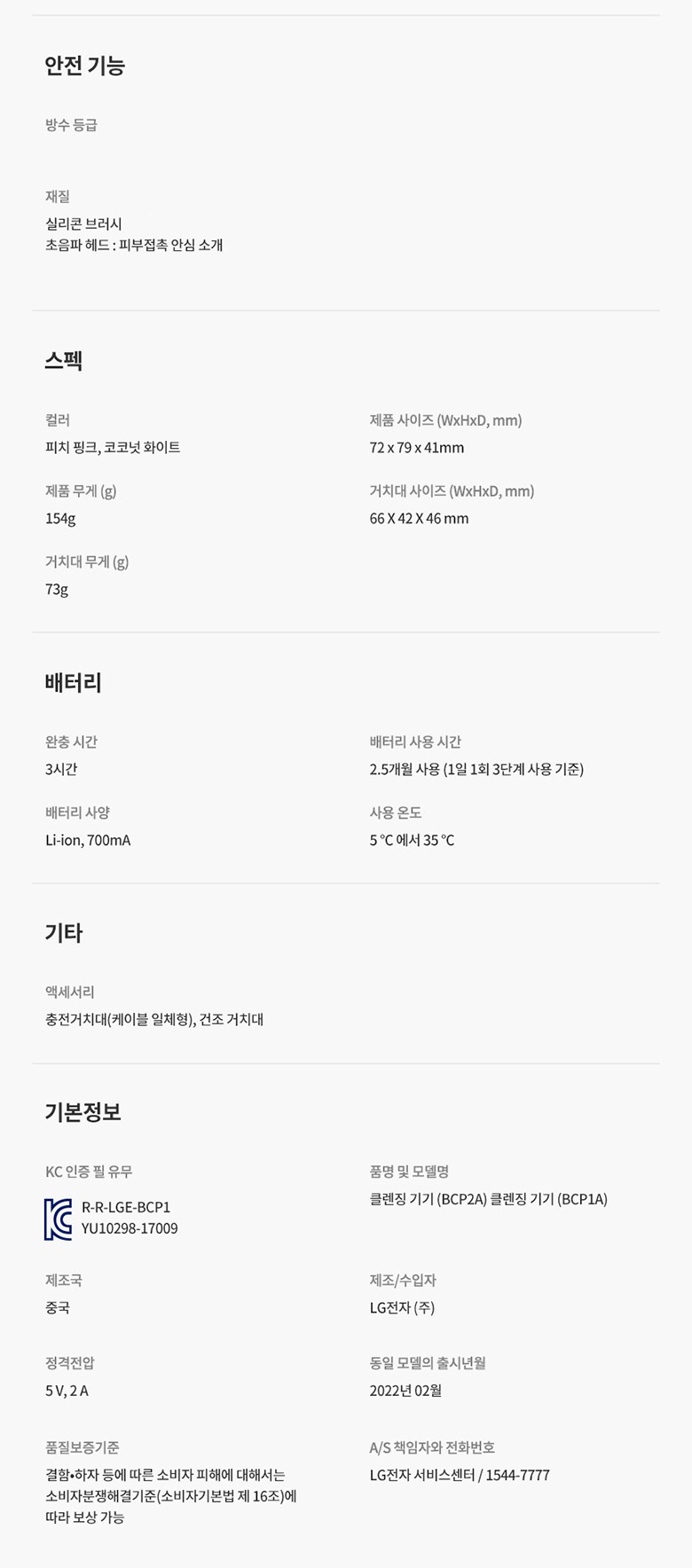 | 품명 및 모델명 | 스킨부스터 + 워시팝 / 스킨부스터 : BBS1 + 워시팝 : BCP2A | KC 인증정보 | 스킨부스터 : R-R-LGE-BBS1 / 스킨부스터 전지 : YU10298-19002 + 워시팝 : R-R-LGE-BCP1 / 워시팝 전지 : YU10298-17009 |