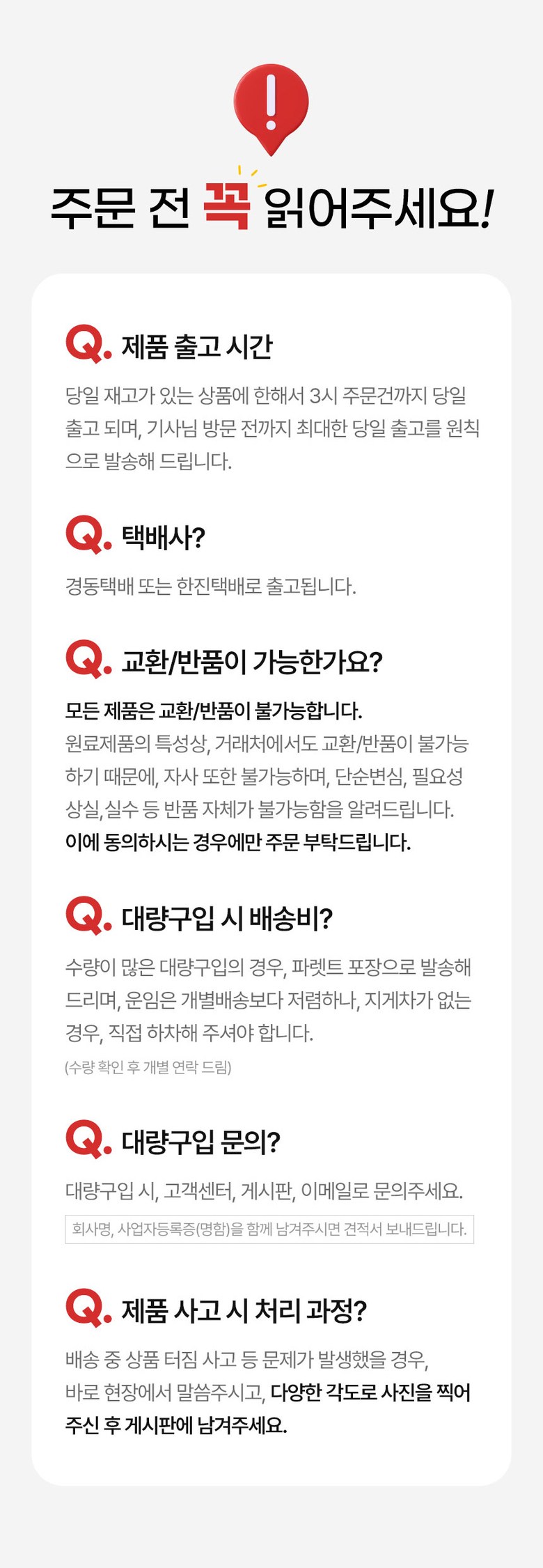 - 가격, 판매자, 교환/환불 및 배송 등 해당 상품 자체와 관련 없는 문의는 고객센터 내 1:1 문의하기를 이용해주세요.