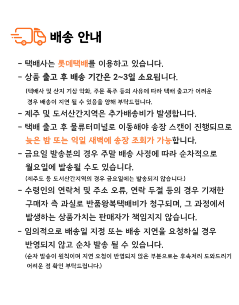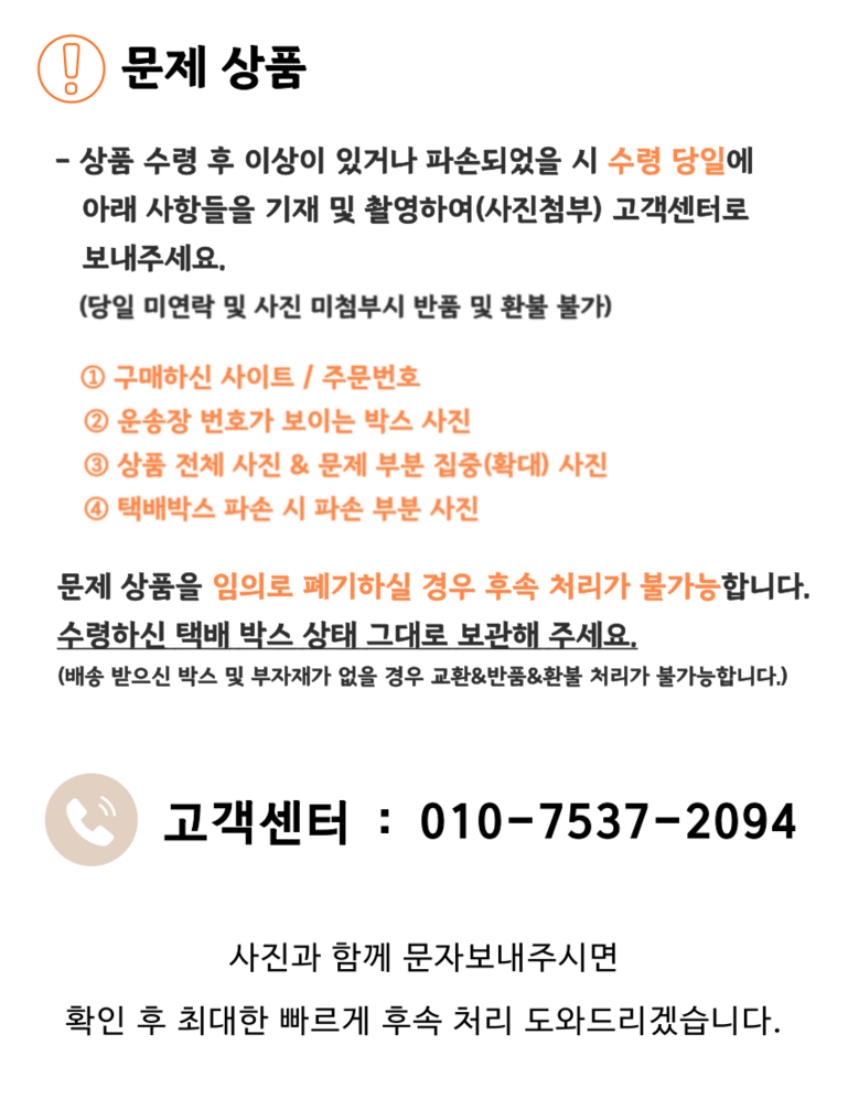 - ㆍ모니터 해상도의 차이로 인해 색상이나 이미지가 실제와 달라, 고객이 단순 변심으로 교환/반품을 무료로 요청하는 경우