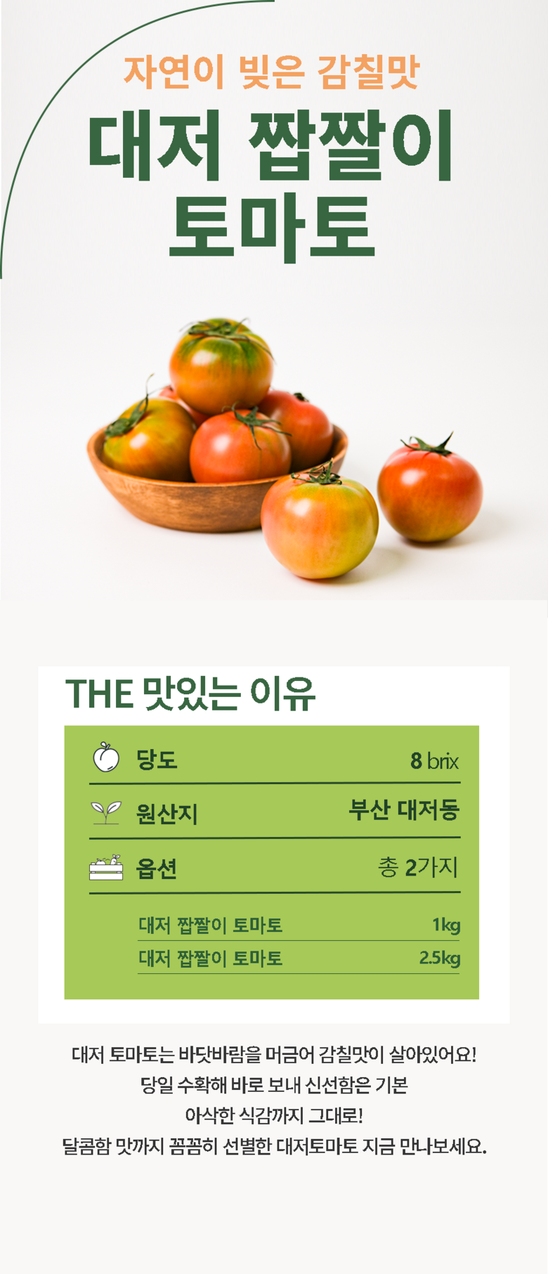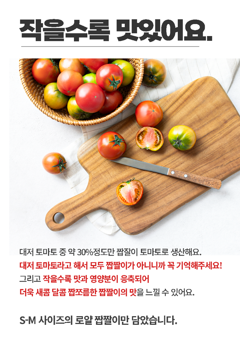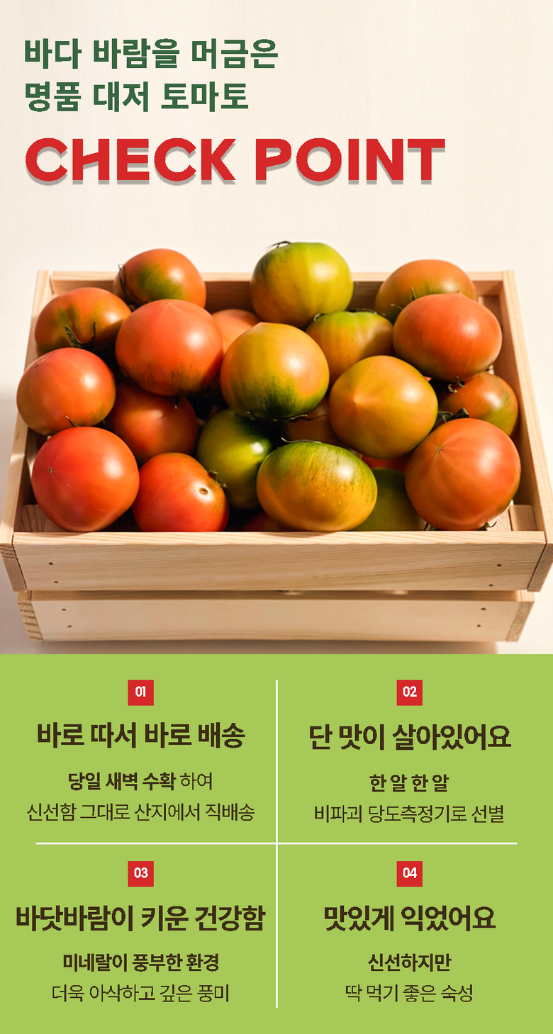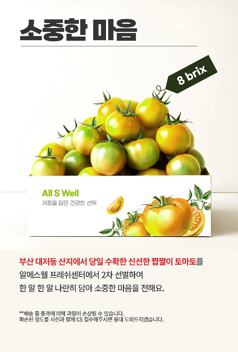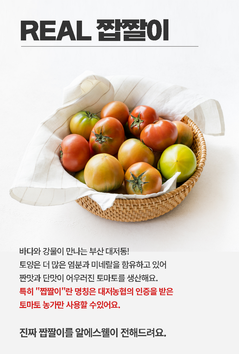 | 품목 또는 명칭 | [산지지송] 대저농협 대저 짭짤이 토마토 | 포장단위별 내용물의 용량(중량),수량,크기 | 1kg, 2.5kg |