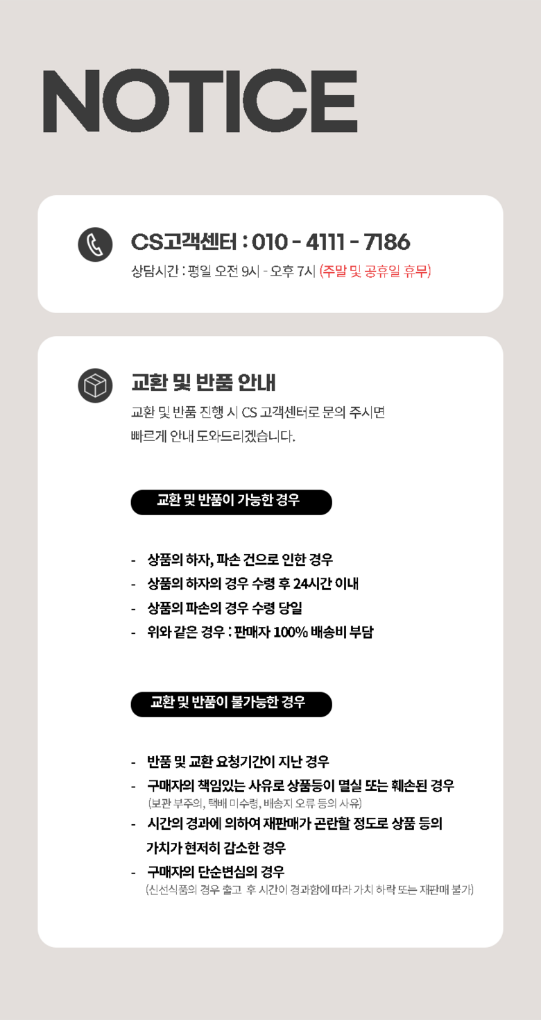| 교환/반품 신청 기준일 | ㆍ단순변심에 의한 교환/반품은 제품 수령 후 7일 이내까지, 교환/반품 제한사항에 해당하지 않는 경우에만 가능 (배송비용과 교환/반품 비용 왕복배송비 고객부담) ㆍ상품의 내용이 표시·광고의 내용과 다른 경우에는 상품을 수령한 날부터 3개월 이내, 그 사실을 안 날 또는 알 수 있었던 날부터 |