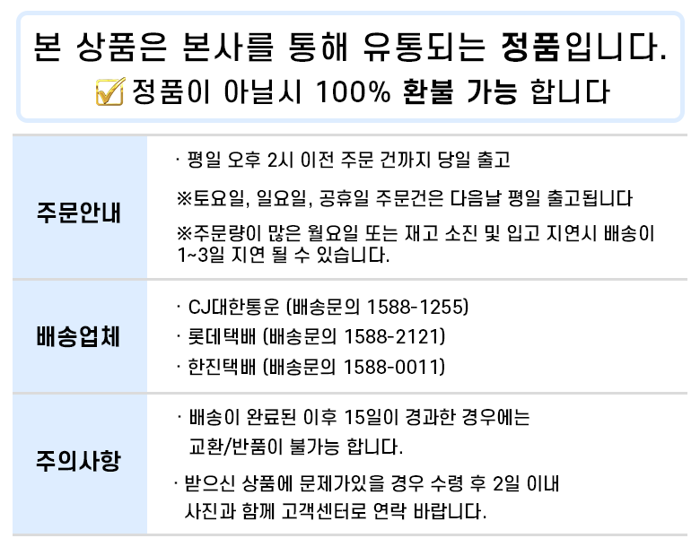 | 배송방법 | 순차배송 | 배송비 | 4,000원 - 50,000원 이상 구매 시 무료배송 - 도서산간 지역 배송불가 |