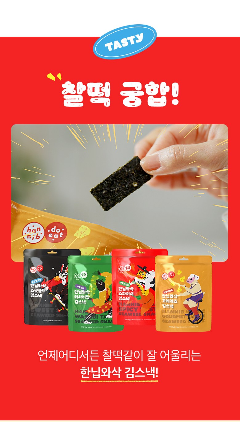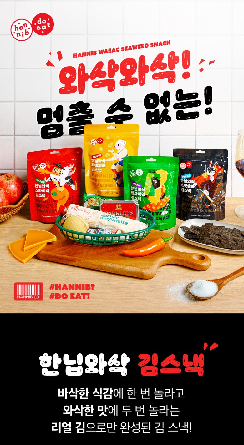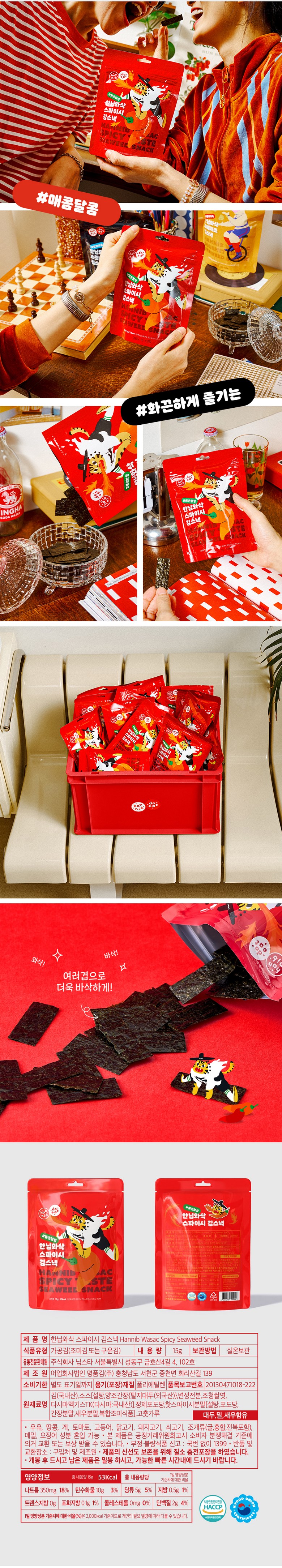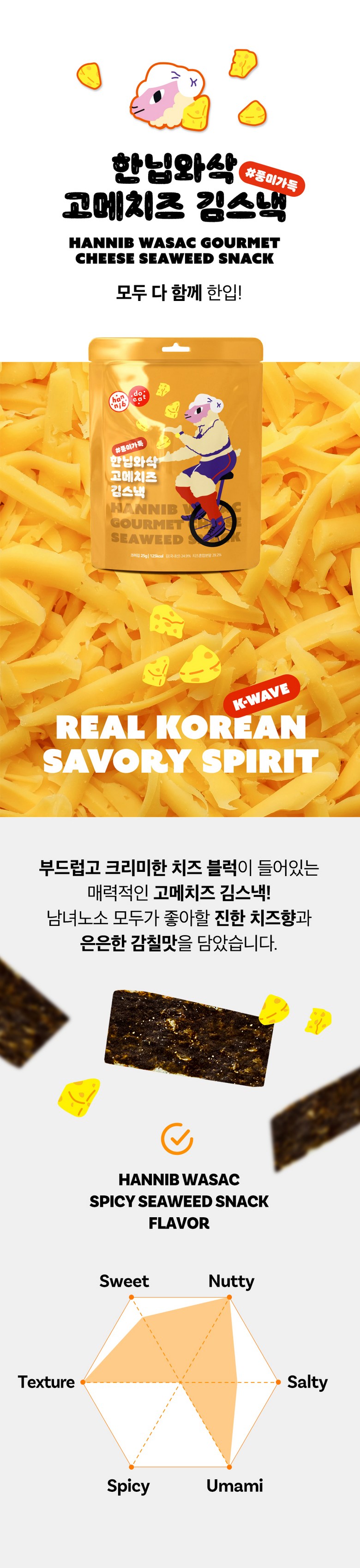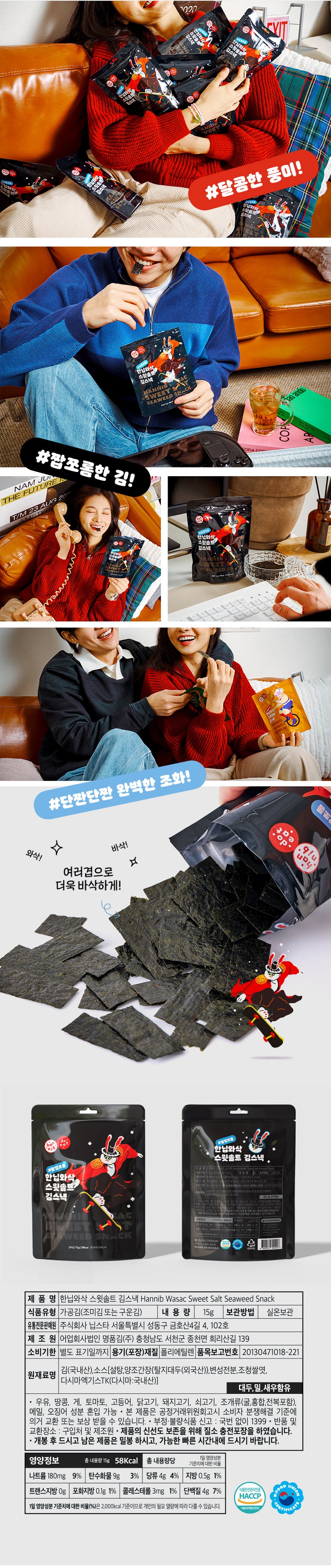 | 포장단위별 내용물의 용량(중량), 수량 | 한닙와삭 스윗솔트 김스낵 15g한닙와삭 와사비맛 김스낵 15g한닙와삭 스파이시 김스낵 15g한닙와식 고메치즈 김스낵 25g | 원재료명 및 함량 | 상품 상세페이지 참조 |