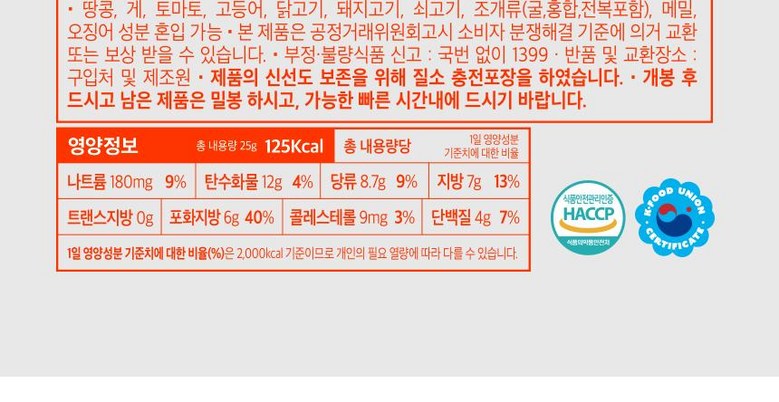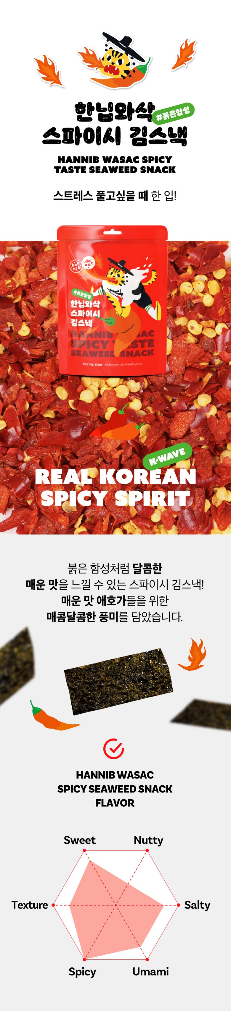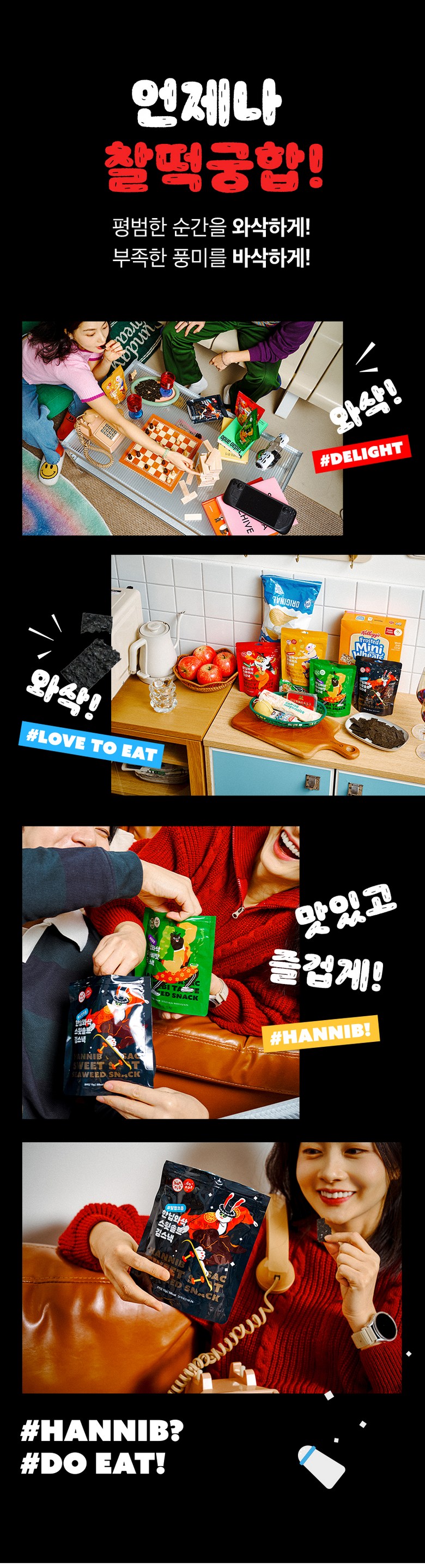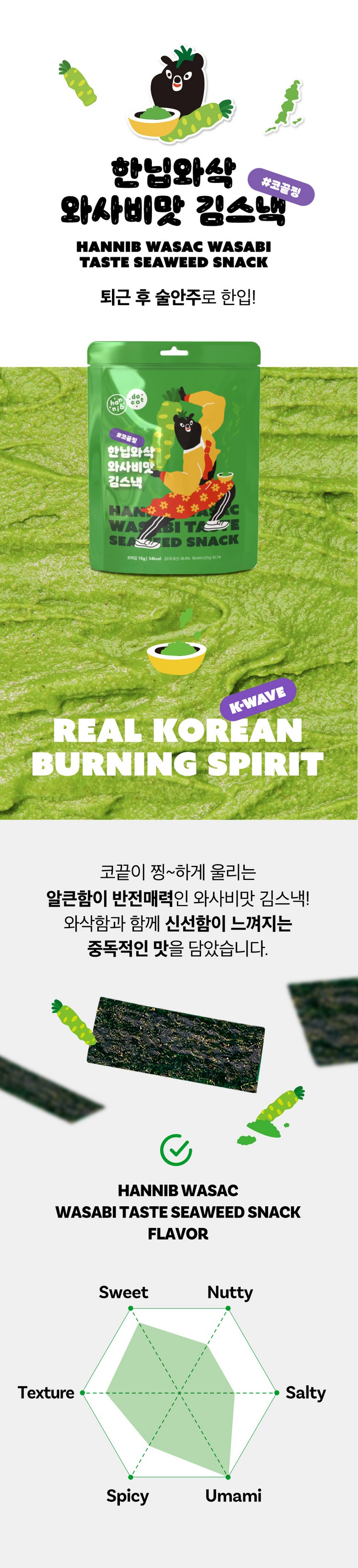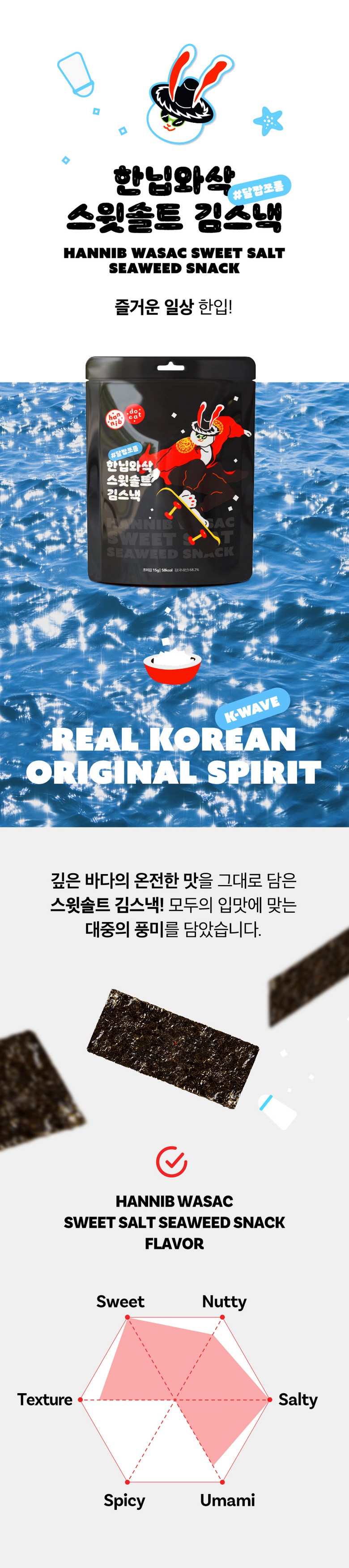 | 포장단위별 내용물의 용량(중량), 수량 | 한닙와삭 스윗솔트 김스낵 15g한닙와삭 와사비맛 김스낵 15g한닙와삭 스파이시 김스낵 15g한닙와식 고메치즈 김스낵 25g | 원재료명 및 함량 | 상품 상세페이지 참조 |