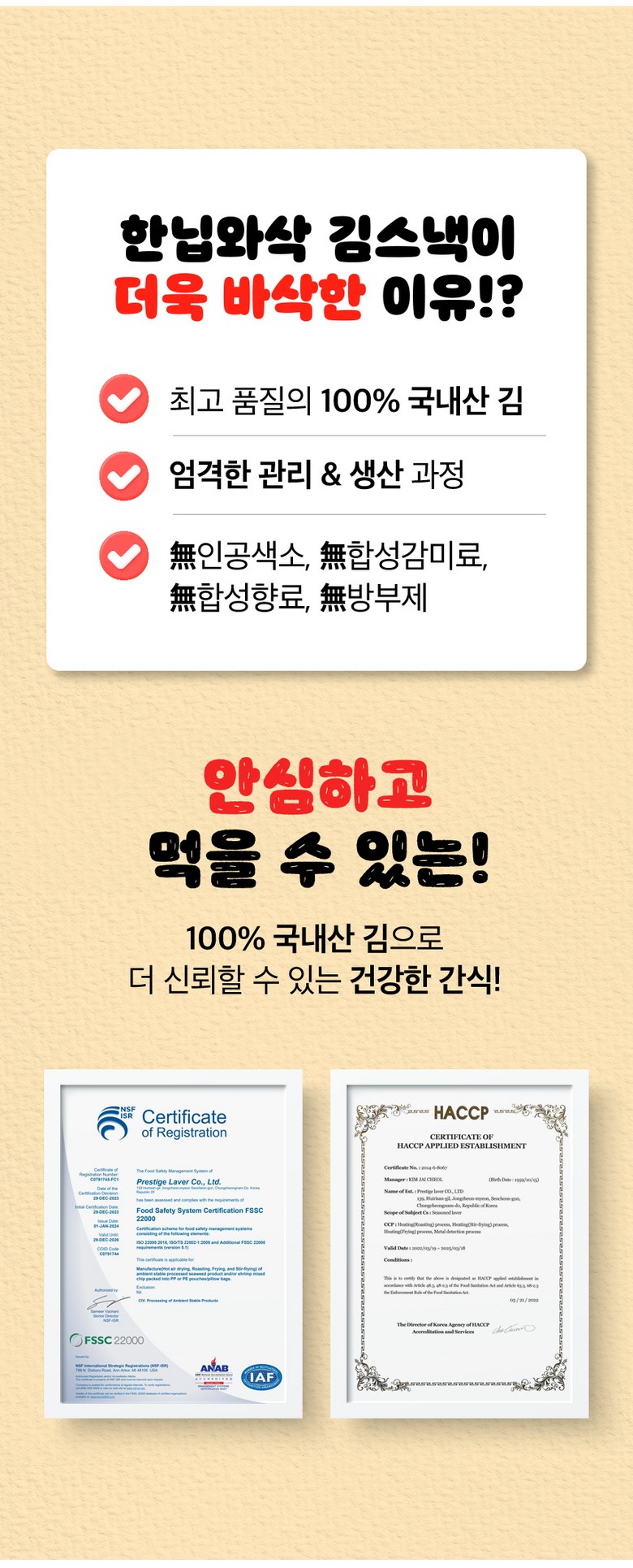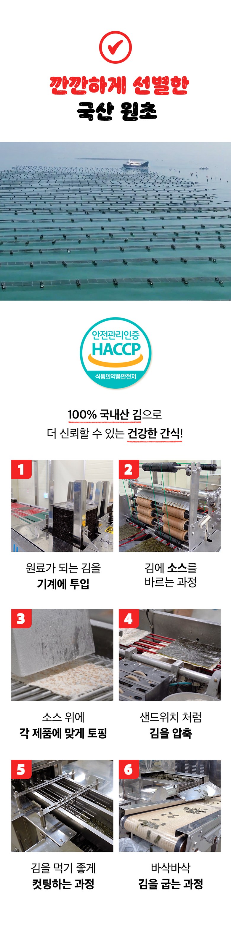 | 제품명 | 한닙와삭 김스낵 | 식품의 유형 | 가공김 (조미김 또는 구운김) |