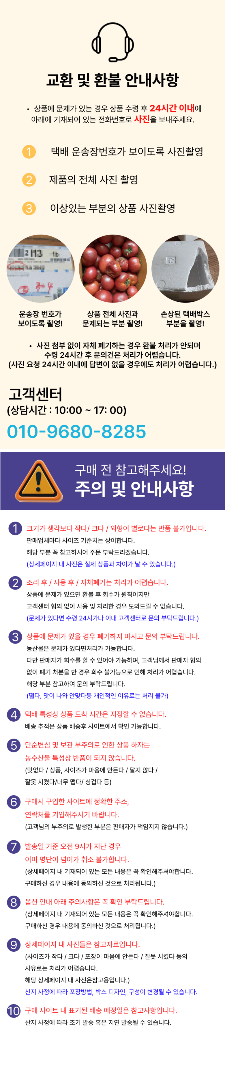 - ㆍ모니터 해상도의 차이로 인해 색상이나 이미지가 실제와 달라, 고객이 단순 변심으로 교환/반품을 무료로 요청하는 경우