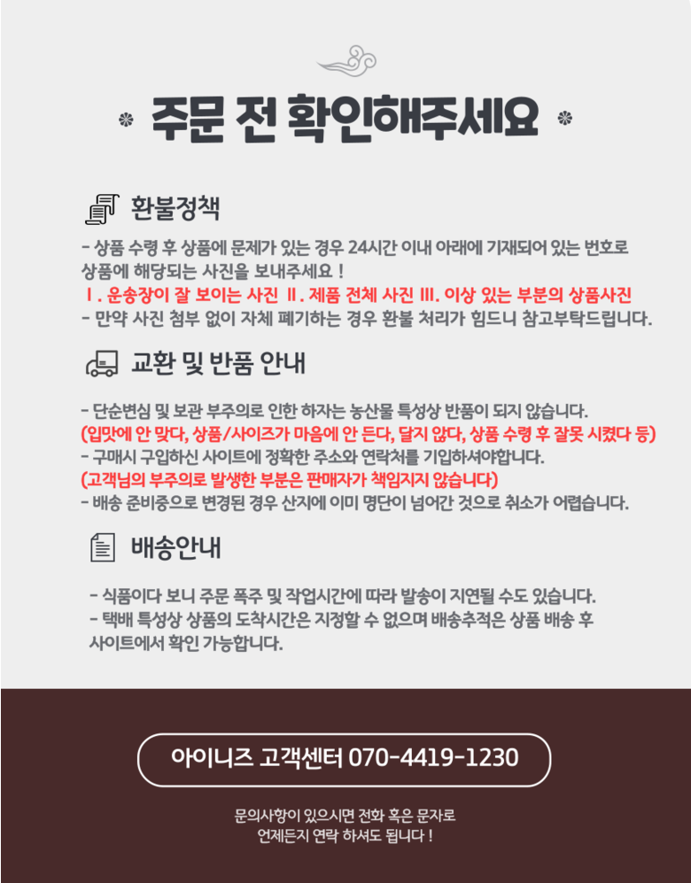 - 상품문의 및 후기게시판을 통해 취소나 환불, 반품 등은 처리되지 않습니다.