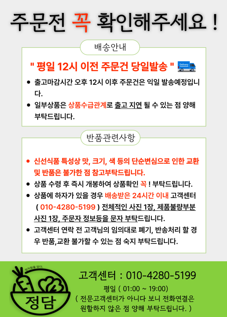 | 배송방법 | 신선/냉장/냉동 | 배송비 | 무료배송 - 도서산간 지역 배송불가 |