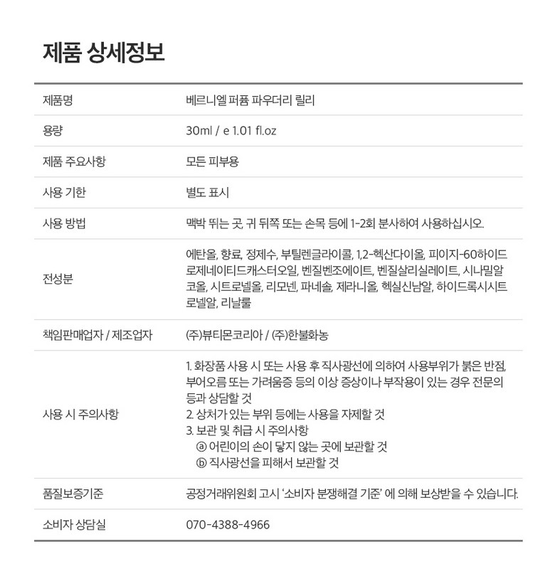 | 용량(중량) | 30ml | 제품 주요 사양 | 상품 상세페이지 참조 |