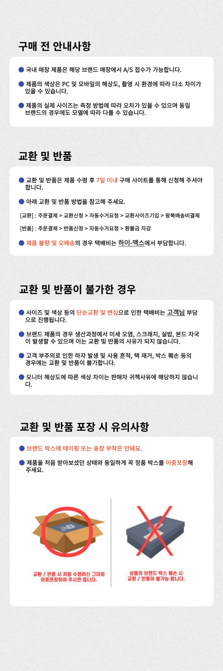 - ㆍ교환/반품에 관한 일반적인 사항은 판매자가 제시사항보다 관계법령이 우선합니다.
