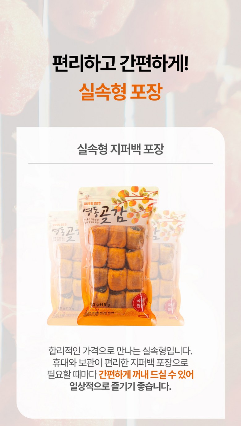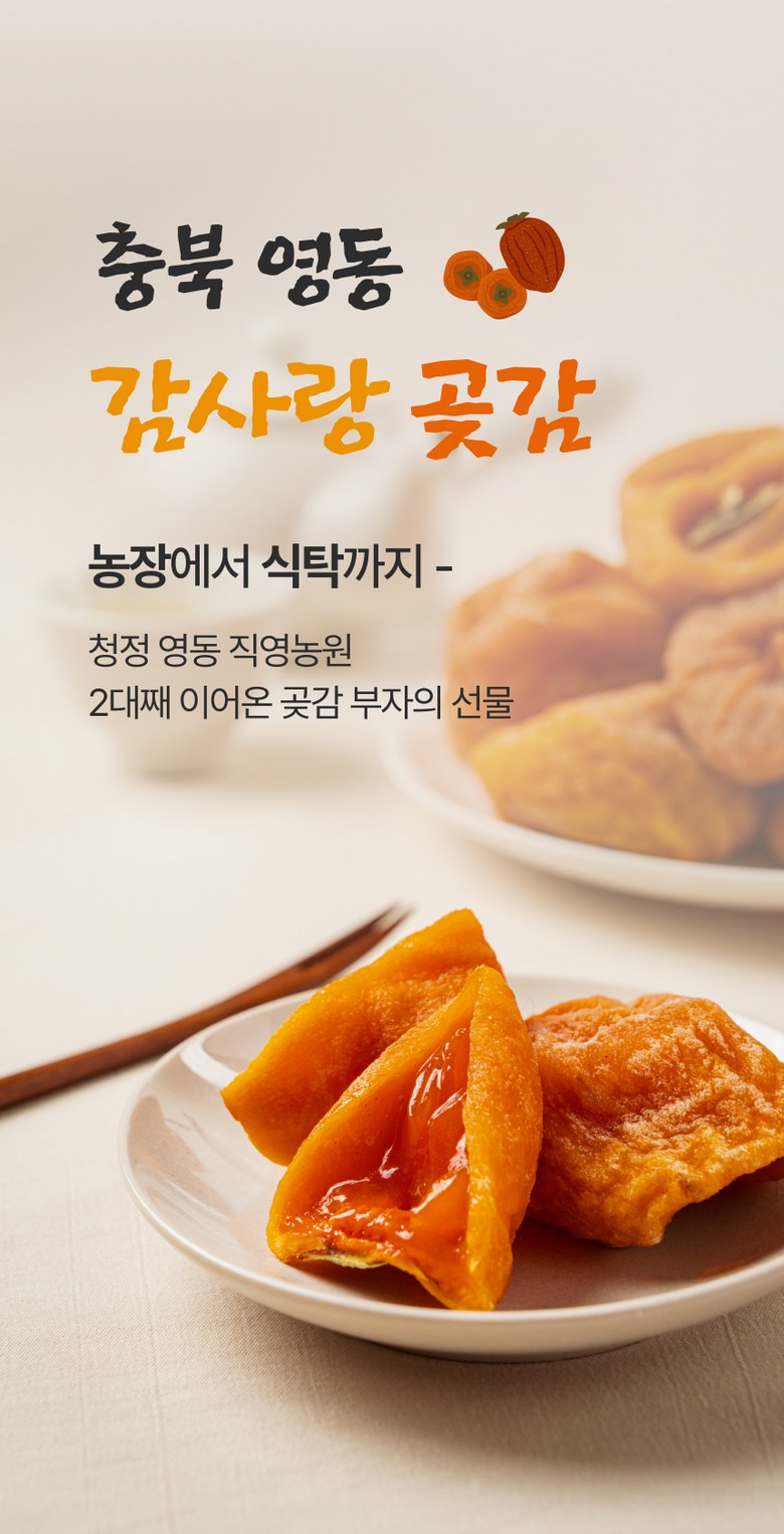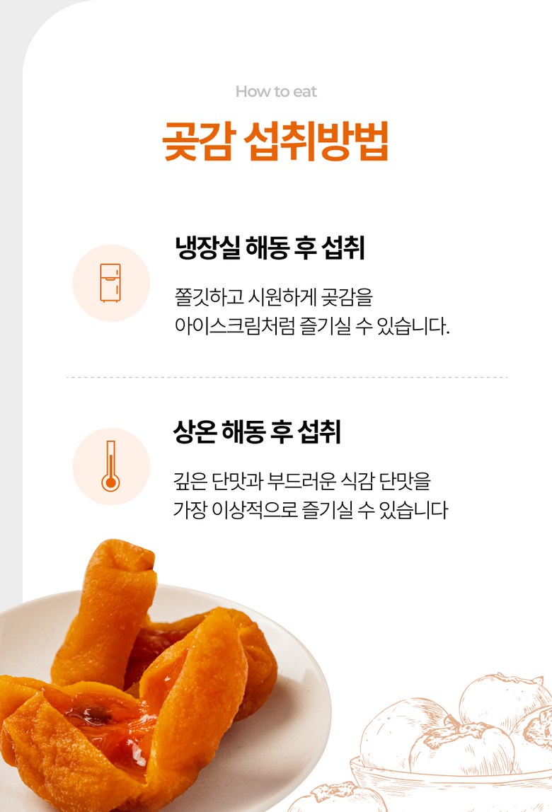 • 곶감 표면의 검은 점은 건조 과정에서 감의 표면이 수축하며 발생하는 자연스러운 현상입니다.