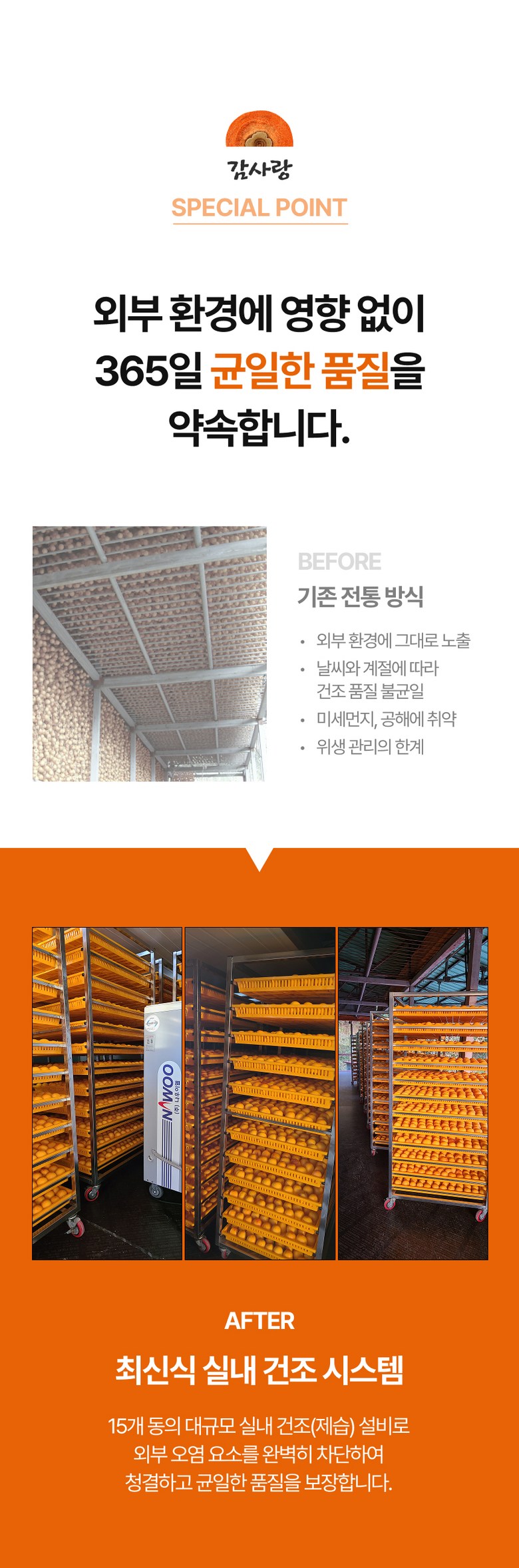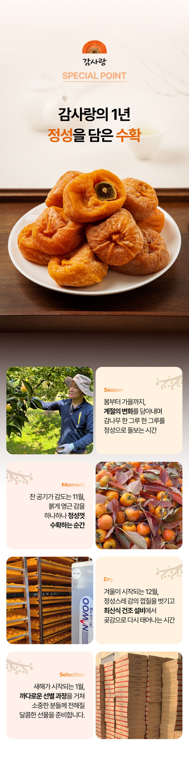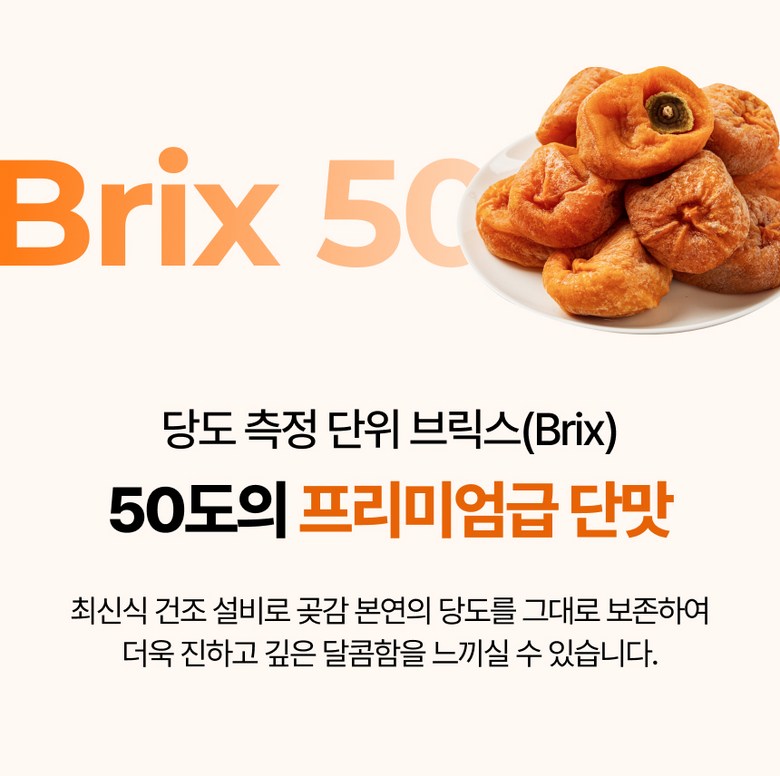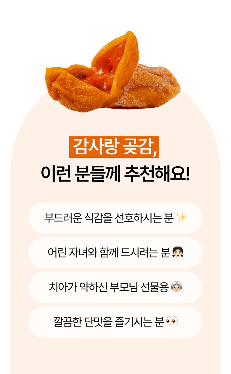 • 곶감 표면의 검은 점은 건조 과정에서 감의 표면이 수축하며 발생하는 자연스러운 현상입니다.