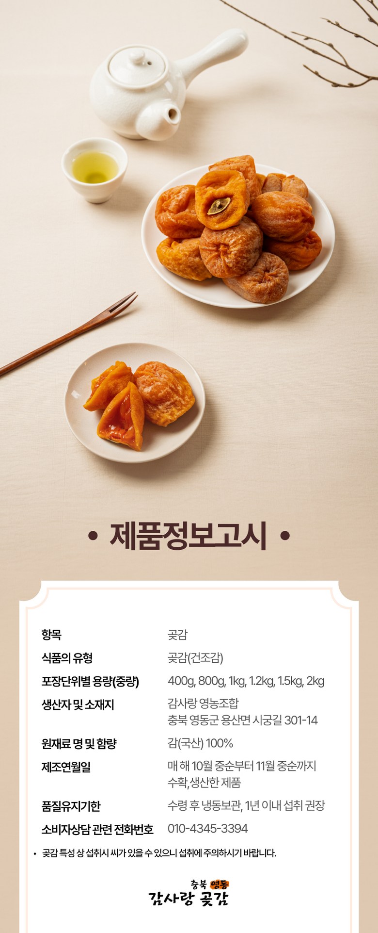 | 품목 또는 명칭 | 곶감 | 포장단위별 내용물의 용량(중량),수량,크기 | 400g, 800g |
